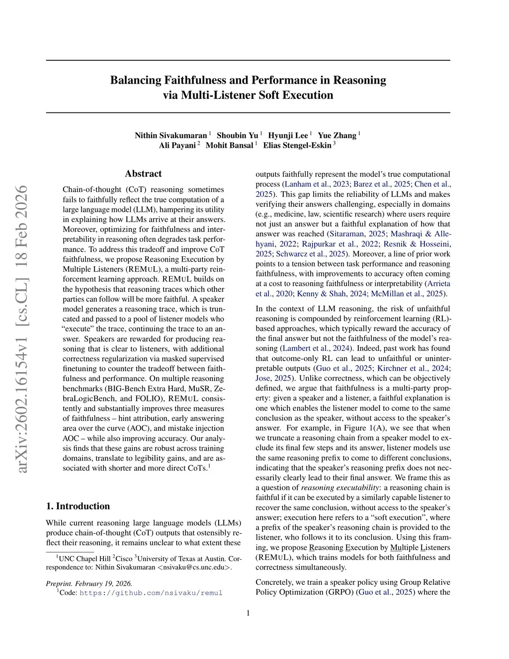 Chain-of-thought (CoT) reasoning sometimes fails to faithfully reflect the true computation of a large language model (LLM), hampering its utility in explaining how LLMs arrive at their answers. Moreover, optimizing for faithfulness and interpretability in reasoning often degrades task performance. To address this tradeoff and improve CoT faithfulness, we propose Reasoning Execution by Multiple Listeners (REMUL), a multi-party reinforcement learning approach. REMUL builds on the hypothesis that reasoning traces which other parties can follow will be more faithful. A speaker model generates a reasoning trace, which is truncated and passed to a pool of listener models who "execute" the trace, continuing the trace to an answer. Speakers are rewarded for producing reasoning that is clear to listeners, with additional correctness regularization via masked supervised finetuning to counter the tradeoff between faithfulness and performance. On multiple reasoning benchmarks (BIG-Bench Extra Hard, MuSR, ZebraLogicBench, and FOLIO), REMUL consistently and substantially improves three measures of faithfulness -- hint attribution, early answering area over the curve (AOC), and mistake injection AOC -- while also improving accuracy. Our analysis finds that these gains are robust across training domains, translate to legibility gains, and are associated with shorter and more direct CoTs.