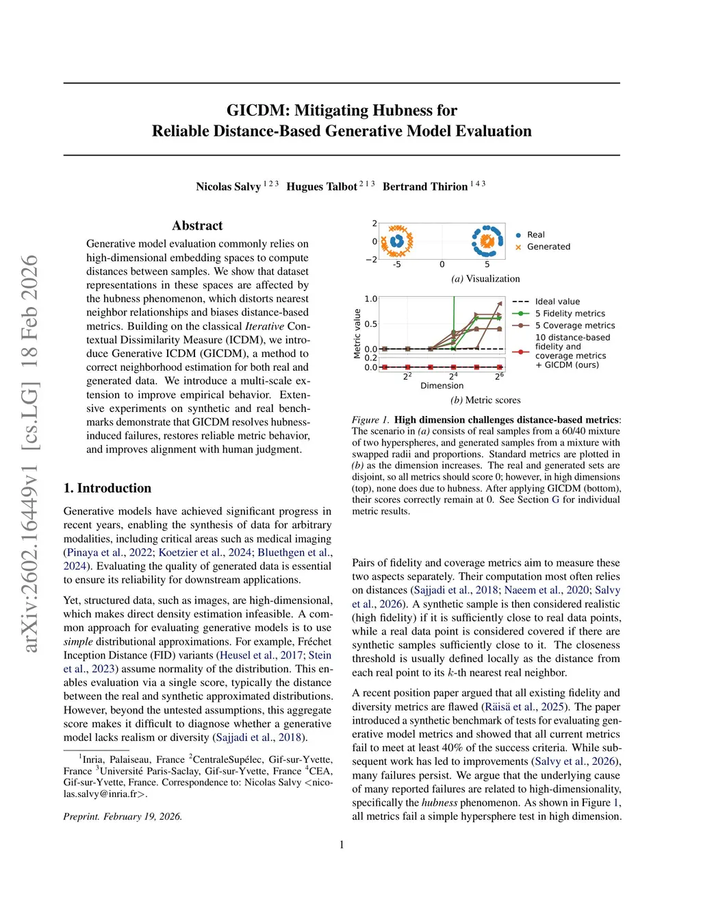 Generative model evaluation commonly relies on high-dimensional embedding spaces to compute distances between samples. We show that dataset representations in these spaces are affected by the hubness phenomenon, which distorts nearest neighbor relationships and biases distance-based metrics. Building on the classical Iterative Contextual Dissimilarity Measure (ICDM), we introduce Generative ICDM (GICDM), a method to correct neighborhood estimation for both real and generated data. We introduce a multi-scale extension to improve empirical behavior. Extensive experiments on synthetic and real benchmarks demonstrate that GICDM resolves hubness-induced failures, restores reliable metric behavior, and improves alignment with human judgment.