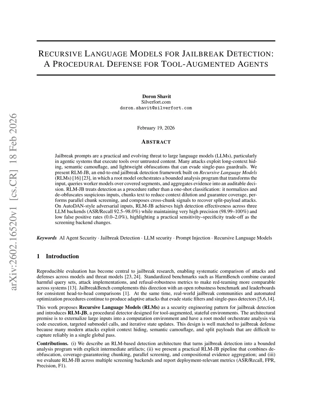 Recursive language models for jailbreak detection: a procedural defense for tool-augmented agents