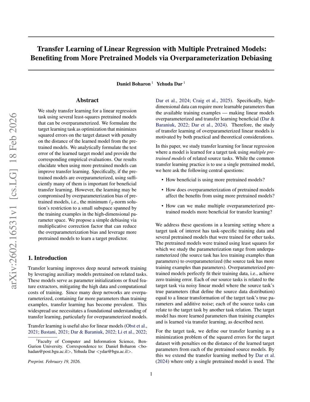 We study transfer learning for a linear regression task using several least-squares pretrained models that can be overparameterized.We formulate the target learning task as optimization that minimizes squared errors on the target dataset with penalty on the distance of the learned model from the pretrained models. We analytically formulate the test error of the learned target model and provide the corresponding empirical evaluations.Our results elucidate when using more pretrained models can improve transfer learning. Specifically, if the pretrained models are overparameterized, using sufficiently many of them is important for beneficial transfer learning. However, the learning may be compromised by overparameterization bias of pretrained models, i.e., the minimum -norm solution's restriction to a small subspace spanned by the training examples in the high-dimensional parameter space. We propose a simple debiasing via multiplicative correction factor that can reduce the overparameterization bias and leverage more pretrained models to learn a target predictor.