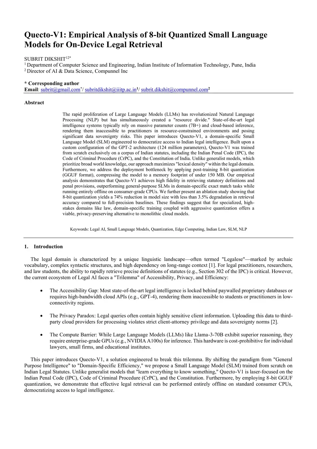 The rapid proliferation of Large Language Models (LLMs) has revolutionized Natural Language Processing (NLP) but has simultaneously created a "resource divide." State-of-the-art legal intelligence systems typically rely on massive parameter counts (7B+) and cloud-based inference, rendering them inaccessible to practitioners in resource-constrained environments and posing significant data sovereignty risks. This paper introduces Quecto-V1, a domain-specific Small Language Model (SLM) engineered to democratize access to Indian legal intelligence. Built upon a custom configuration of the GPT-2 architecture (124 million parameters), Quecto-V1 was trained from scratch exclusively on a corpus of Indian statutes, including the Indian Penal Code (IPC), the Code of Criminal Procedure (CrPC), and the Constitution of India. Unlike generalist models, which prioritize broad world knowledge, our approach maximizes "lexical density" within the legal domain. Furthermore, we address the deployment bottleneck by applying post-training 8-bit quantization (GGUF format), compressing the model to a memory footprint of under 150 MB. Our empirical analysis demonstrates that Quecto-V1 achieves high fidelity in retrieving statutory definitions and penal provisions, outperforming general-purpose SLMs in domain-specific exact match tasks while running entirely offline on consumer-grade CPUs. We further present an ablation study showing that 8-bit quantization yields a 74% reduction in model size with less than 3.5% degradation in retrieval accuracy compared to full-precision baselines. These findings suggest that for specialized, high-stakes domains like law, domain-specific training coupled with aggressive quantization offers a viable, privacy-preserving alternative to monolithic cloud models.