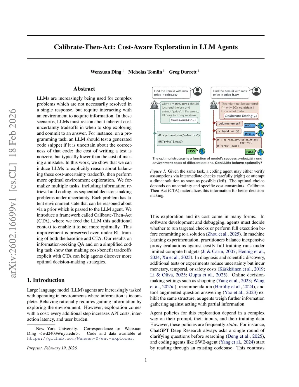 LLMs are increasingly being used for complex problems which are not necessarily resolved in a single response, but require interacting with an environment to acquire information. In these scenarios, LLMs must reason about inherent cost-uncertainty tradeoffs in when to stop exploring and commit to an answer. For instance, on a programming task, an LLM should test a generated code snippet if it is uncertain about the correctness of that code; the cost of writing a test is nonzero, but typically lower than the cost of making a mistake. In this work, we show that we can induce LLMs to explicitly reason about balancing these cost-uncertainty tradeoffs, then perform more optimal environment exploration. We formalize multiple tasks, including information retrieval and coding, as sequential decision-making problems under uncertainty. Each problem has latent environment state that can be reasoned about via a prior which is passed to the LLM agent. We introduce a framework called Calibrate-Then-Act (CTA), where we feed the LLM this additional context to enable it to act more optimally. This improvement is preserved even under RL training of both the baseline and CTA. Our results on information-seeking QA and on a simplified coding task show that making cost-benefit tradeoffs explicit with CTA can help agents discover more optimal decision-making strategies.