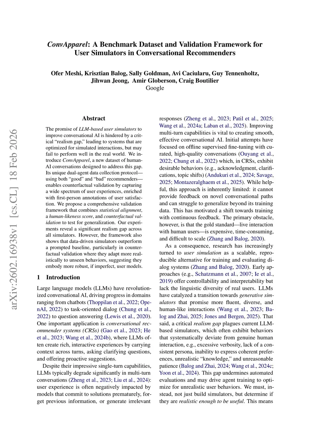 The promise of LLM-based user simulators to improve conversational AI is hindered by a critical "realism gap," leading to systems that are optimized for simulated interactions, but may fail to perform well in the real world. We introduce ConvApparel, a new dataset of human-AI conversations designed to address this gap. Its unique dual-agent data collection protocol -- using both "good" and "bad" recommenders -- enables counterfactual validation by capturing a wide spectrum of user experiences, enriched with first-person annotations of user satisfaction. We propose a comprehensive validation framework that combines statistical alignment, a human-likeness score, and counterfactual validation to test for generalization. Our experiments reveal a significant realism gap across all simulators. However, the framework also shows that data-driven simulators outperform a prompted baseline, particularly in counterfactual validation where they adapt more realistically to unseen behaviors, suggesting they embody more robust, if imperfect, user models.
