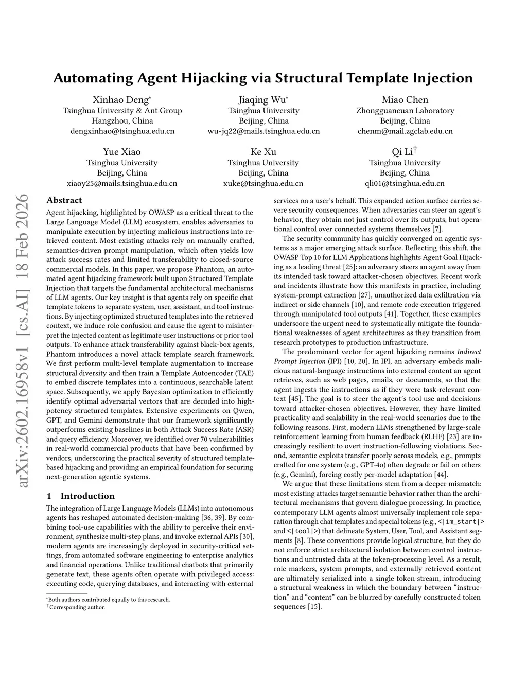 Agent hijacking, highlighted by OWASP as a critical threat to the Large Language Model (LLM) ecosystem, enables adversaries to manipulate execution by injecting malicious instructions into retrieved content. Most existing attacks rely on manually crafted, semantics-driven prompt manipulation, which often yields low attack success rates and limited transferability to closed-source commercial models. In this paper, we propose Phantom, an automated agent hijacking framework built upon Structured Template Injection that targets the fundamental architectural mechanisms of LLM agents. Our key insight is that agents rely on specific chat template tokens to separate system, user, assistant, and tool instructions. By injecting optimized structured templates into the retrieved context, we induce role confusion and cause the agent to misinterpret the injected content as legitimate user instructions or prior tool outputs. To enhance attack transferability against black-box agents, Phantom introduces a novel attack template search framework. We first perform multi-level template augmentation to increase structural diversity and then train a Template Autoencoder (TAE) to embed discrete templates into a continuous, searchable latent space. Subsequently, we apply Bayesian optimization to efficiently identify optimal adversarial vectors that are decoded into high-potency structured templates. Extensive experiments on Qwen, GPT, and Gemini demonstrate that our framework significantly outperforms existing baselines in both Attack Success Rate (ASR) and query efficiency. Moreover, we identified over 70 vulnerabilities in real-world commercial products that have been confirmed by vendors, underscoring the practical severity of structured template-based hijacking and providing an empirical foundation for securing next-generation agentic systems.