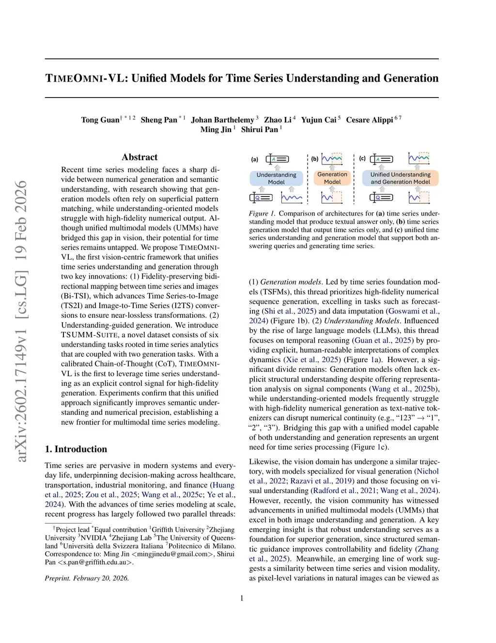 Recent time series modeling faces a sharp divide between numerical generation and semantic understanding, with research showing that generation models often rely on superficial pattern matching, while understanding-oriented models struggle with high-fidelity numerical output. Although unified multimodal models (UMMs) have bridged this gap in vision, their potential for time series remains untapped. We propose TimeOmni-VL, the first vision-centric framework that unifies time series understanding and generation through two key innovations: (1) Fidelity-preserving bidirectional mapping between time series and images (Bi-TSI), which advances Time Series-to-Image (TS2I) and Image-to-Time Series (I2TS) conversions to ensure near-lossless transformations. (2) Understanding-guided generation. We introduce TSUMM-Suite, a novel dataset consists of six understanding tasks rooted in time series analytics that are coupled with two generation tasks. With a calibrated Chain-of-Thought, TimeOmni-VL is the first to leverage time series understanding as an explicit control signal for high-fidelity generation. Experiments confirm that this unified approach significantly improves both semantic understanding and numerical precision, establishing a new frontier for multimodal time series modeling.