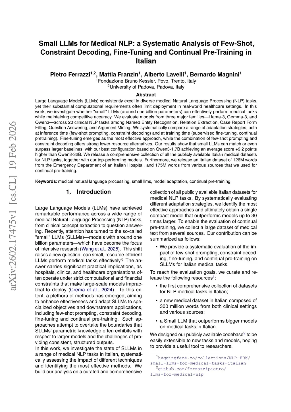 Large Language Models (LLMs) consistently excel in diverse medical Natural Language Processing (NLP) tasks, yet their substantial computational requirements often limit deployment in real-world healthcare settings. In this work, we investigate whether "small" LLMs (around one billion parameters) can effectively perform medical tasks while maintaining competitive accuracy. We evaluate models from three major families-Llama-3, Gemma-3, and Qwen3-across 20 clinical NLP tasks among Named Entity Recognition, Relation Extraction, Case Report Form Filling, Question Answering, and Argument Mining. We systematically compare a range of adaptation strategies, both at inference time (few-shot prompting, constraint decoding) and at training time (supervised fine-tuning, continual pretraining). Fine-tuning emerges as the most effective approach, while the combination of few-shot prompting and constraint decoding offers strong lower-resource alternatives. Our results show that small LLMs can match or even surpass larger baselines, with our best configuration based on Qwen3-1.7B achieving an average score +9.2 points higher than Qwen3-32B. We release a comprehensive collection of all the publicly available Italian medical datasets for NLP tasks, together with our top-performing models. Furthermore, we release an Italian dataset of 126M words from the Emergency Department of an Italian Hospital, and 175M words from various sources that we used for continual pre-training.