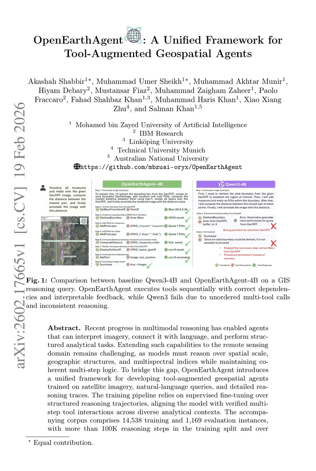 Recent progress in multimodal reasoning has enabled agents that interpret imagery, connect it with language, and execute structured analytical tasks. Extending these capabilities to remote sensing remains challenging, as models must reason over spatial scale, geographic structures, and multispectral indices while maintaining coherent multi-step logic. To address this gap, we introduce \textit{OpenEarthAgent}, a unified framework for tool-augmented geospatial reasoning trained on satellite imagery, natural-language queries, and structured reasoning traces. Beyond serving as a benchmark, OpenEarthAgent establishes a cohesive agentic architecture built around a unified executable tool registry and trajectory-based policy learning. The framework standardizes heterogeneous visual, spectral, GIS, and georeferenced raster operations under a consistent callable schema, enabling modular orchestration and deterministic execution. Training is performed via supervised fine-tuning on structured reasoning trajectories with deterministic replay validation to ensure executability and spatial correctness. The accompanying corpus comprises 14,538 training and 1,169 evaluation instances with over 107K reasoning steps, spanning urban, environmental, disaster, and infrastructure domains and incorporating GIS operations alongside index analyses such as NDVI, NBR, and NDBI. Grounded in explicit reasoning traces, the learned agent demonstrates structured reasoning, stable spatial understanding, and interpretable tool-driven behaviour across diverse EO scenarios. We report consistent improvements over a strong baseline and competitive performance against recent open and closed-source models. Our code and trained models will be publicly available.