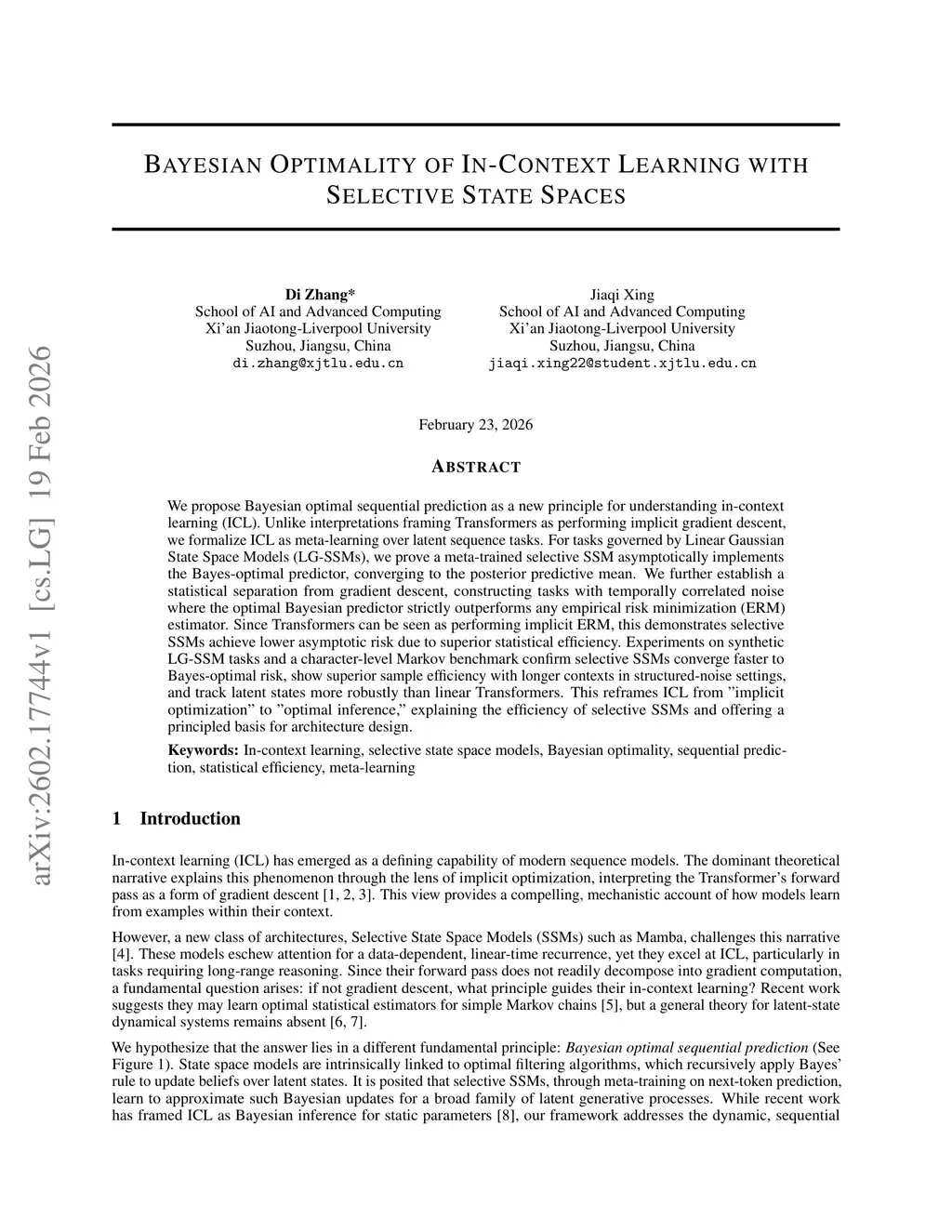 We propose Bayesian optimal sequential prediction as a new principle for understanding in-context learning (ICL). Unlike interpretations framing Transformers as performing implicit gradient descent, we formalize ICL as meta-learning over latent sequence tasks. For tasks governed by Linear Gaussian State Space Models (LG-SSMs), we prove a meta-trained selective SSM asymptotically implements the Bayes-optimal predictor, converging to the posterior predictive mean. We further establish a statistical separation from gradient descent, constructing tasks with temporally correlated noise where the optimal Bayesian predictor strictly outperforms any empirical risk minimization (ERM) estimator. Since Transformers can be seen as performing implicit ERM, this demonstrates selective SSMs achieve lower asymptotic risk due to superior statistical efficiency. Experiments on synthetic LG-SSM tasks and a character-level Markov benchmark confirm selective SSMs converge faster to Bayes-optimal risk, show superior sample efficiency with longer contexts in structured-noise settings, and track latent states more robustly than linear Transformers. This reframes ICL from "implicit optimization" to "optimal inference," explaining the efficiency of selective SSMs and offering a principled basis for architecture design.
