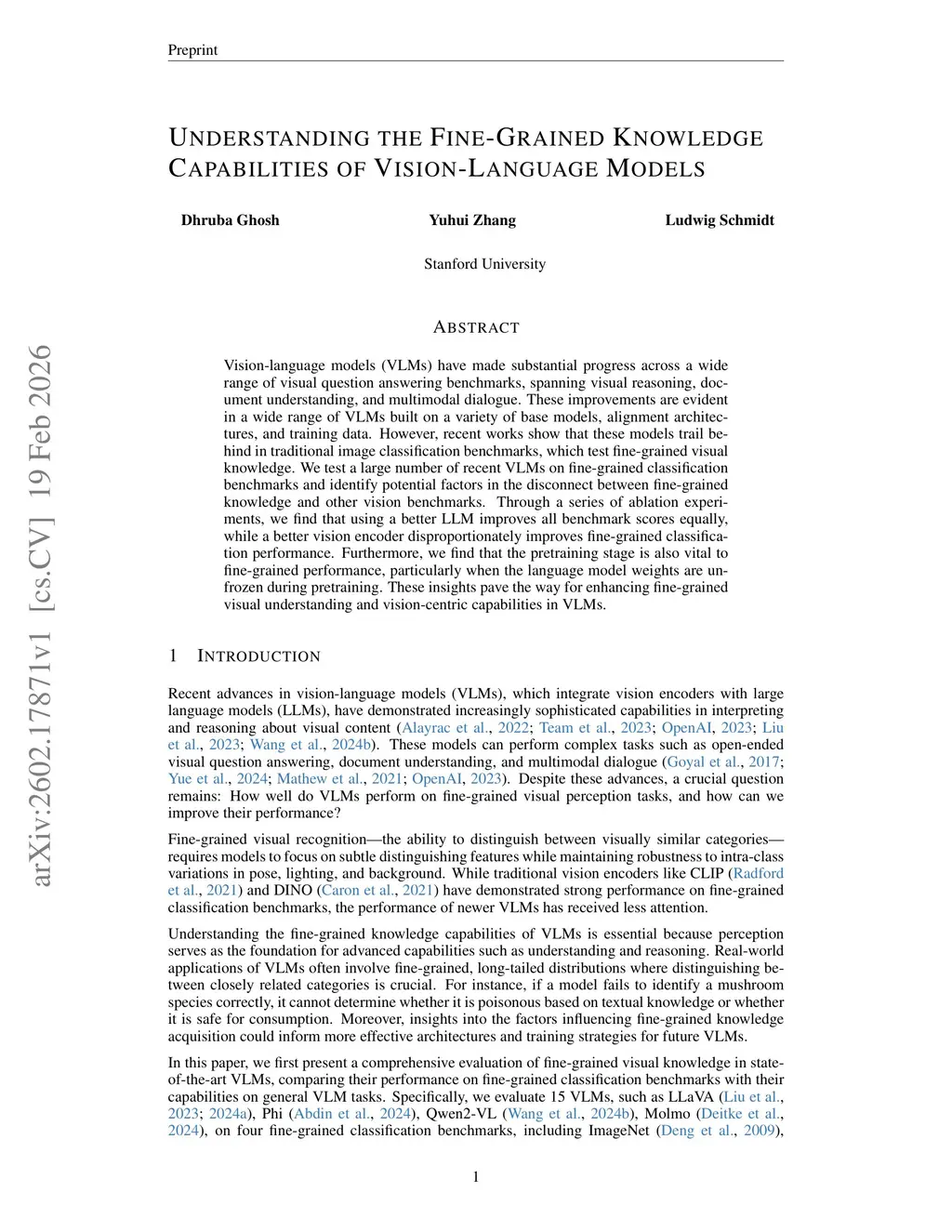 Vision-language models (VLMs) have made substantial progress across a wide range of visual question answering benchmarks, spanning visual reasoning, document understanding, and multimodal dialogue. These improvements are evident in a wide range of VLMs built on a variety of base models, alignment architectures, and training data. However, recent works show that these models trail behind in traditional image classification benchmarks, which test fine-grained visual knowledge. We test a large number of recent VLMs on fine-grained classification benchmarks and identify potential factors in the disconnect between fine-grained knowledge and other vision benchmarks. Through a series of ablation experiments, we find that using a better LLM improves all benchmark scores equally, while a better vision encoder disproportionately improves fine-grained classification performance. Furthermore, we find that the pretraining stage is also vital to fine-grained performance, particularly when the language model weights are unfrozen during pretraining. These insights pave the way for enhancing fine-grained visual understanding and vision-centric capabilities in VLMs.
