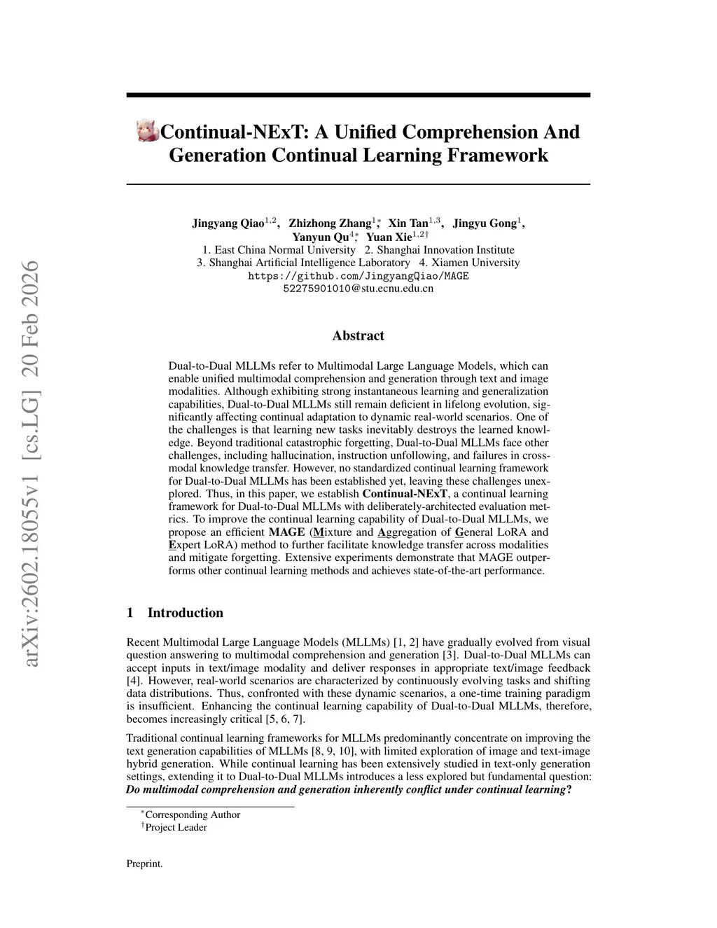 Dual-to-Dual MLLMs refer to Multimodal Large Language Models, which can enable unified multimodal comprehension and generation through text and image modalities. Although exhibiting strong instantaneous learning and generalization capabilities, Dual-to-Dual MLLMs still remain deficient in lifelong evolution, significantly affecting continual adaptation to dynamic real-world scenarios. One of the challenges is that learning new tasks inevitably destroys the learned knowledge. Beyond traditional catastrophic forgetting, Dual-to-Dual MLLMs face other challenges, including hallucination, instruction unfollowing, and failures in cross-modal knowledge transfer. However, no standardized continual learning framework for Dual-to-Dual MLLMs has been established yet, leaving these challenges unexplored. Thus, in this paper, we establish Continual-NExT, a continual learning framework for Dual-to-Dual MLLMs with deliberately-architected evaluation metrics. To improve the continual learning capability of Dual-to-Dual MLLMs, we propose an efficient MAGE (Mixture and Aggregation of General LoRA and Expert LoRA) method to further facilitate knowledge transfer across modalities and mitigate forgetting. Extensive experiments demonstrate that MAGE outperforms other continual learning methods and achieves state-of-the-art performance.
