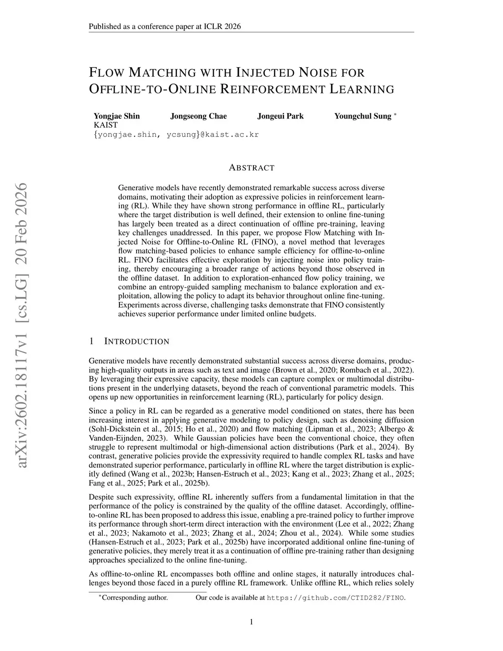 Generative models have recently demonstrated remarkable success across diverse domains, motivating their adoption as expressive policies in reinforcement learning (RL). While they have shown strong performance in offline RL, particularly where the target distribution is well defined, their extension to online fine-tuning has largely been treated as a direct continuation of offline pre-training, leaving key challenges unaddressed. In this paper, we propose Flow Matching with Injected Noise for Offline-to-Online RL (FINO), a novel method that leverages flow matching-based policies to enhance sample efficiency for offline-to-online RL. FINO facilitates effective exploration by injecting noise into policy training, thereby encouraging a broader range of actions beyond those observed in the offline dataset. In addition to exploration-enhanced flow policy training, we combine an entropy-guided sampling mechanism to balance exploration and exploitation, allowing the policy to adapt its behavior throughout online fine-tuning. Experiments across diverse, challenging tasks demonstrate that FINO consistently achieves superior performance under limited online budgets.