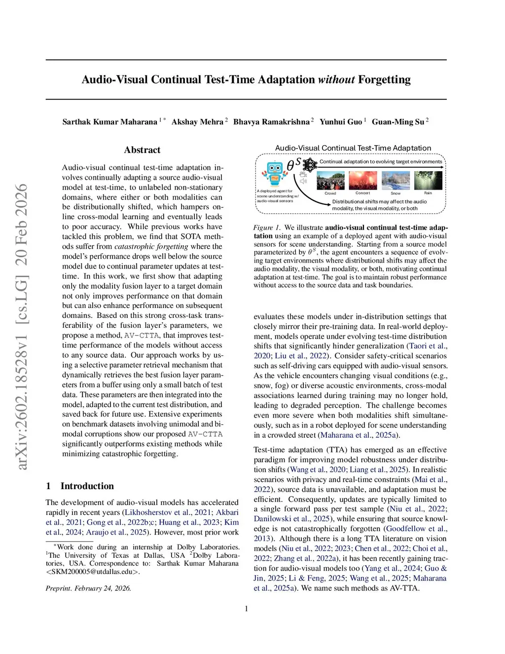 Audio-visual continual test-time adaptation involves continually adapting a source audio-visual model at test-time, to unlabeled non-stationary domains, where either or both modalities can be distributionally shifted, which hampers online cross-modal learning and eventually leads to poor accuracy. While previous works have tackled this problem, we find that SOTA methods suffer from catastrophic forgetting, where the model's performance drops well below the source model due to continual parameter updates at test-time. In this work, we first show that adapting only the modality fusion layer to a target domain not only improves performance on that domain but can also enhance performance on subsequent domains. Based on this strong cross-task transferability of the fusion layer's parameters, we propose a method, , that improves test-time performance of the models without access to any source data. Our approach works by using a selective parameter retrieval mechanism that dynamically retrieves the best fusion layer parameters from a buffer using only a small batch of test data. These parameters are then integrated into the model, adapted to the current test distribution, and saved back for future use. Extensive experiments on benchmark datasets involving unimodal and bimodal corruptions show our proposed significantly outperforms existing methods while minimizing catastrophic forgetting.