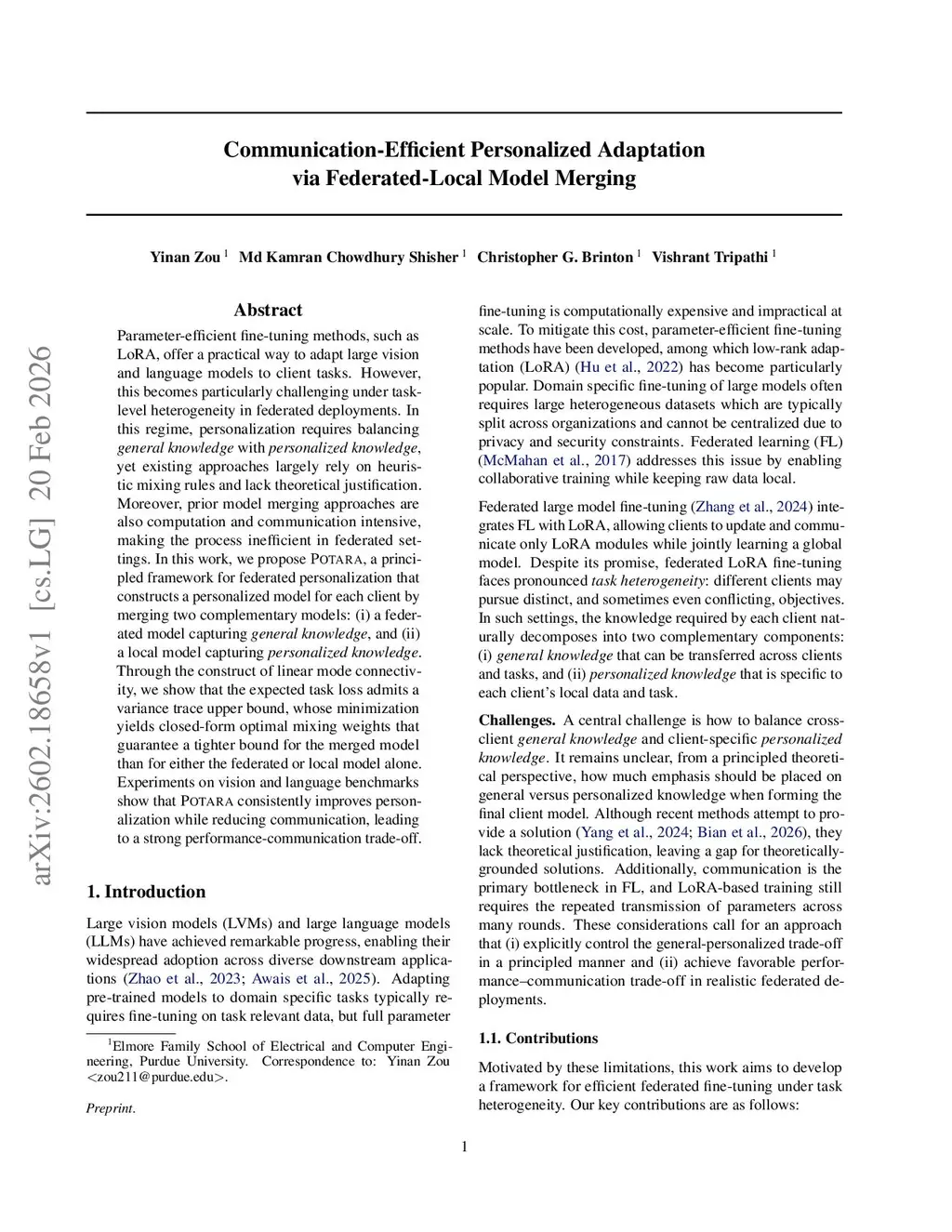 Parameter-efficient fine-tuning methods, such as LoRA, offer a practical way to adapt large vision and language models to client tasks. However, this becomes particularly challenging under task-level heterogeneity in federated deployments. In this regime, personalization requires balancing general knowledge with personalized knowledge, yet existing approaches largely rely on heuristic mixing rules and lack theoretical justification. Moreover, prior model merging approaches are also computation and communication intensive, making the process inefficient in federated settings. In this work, we propose Potara, a principled framework for federated personalization that constructs a personalized model for each client by merging two complementary models: (i) a federated model capturing general knowledge, and (ii) a local model capturing personalized knowledge. Through the construct of linear mode connectivity, we show that the expected task loss admits a variance trace upper bound, whose minimization yields closed-form optimal mixing weights that guarantee a tighter bound for the merged model than for either the federated or local model alone. Experiments on vision and language benchmarks show that Potara consistently improves personalization while reducing communication, leading to a strong performance-communication trade-off.