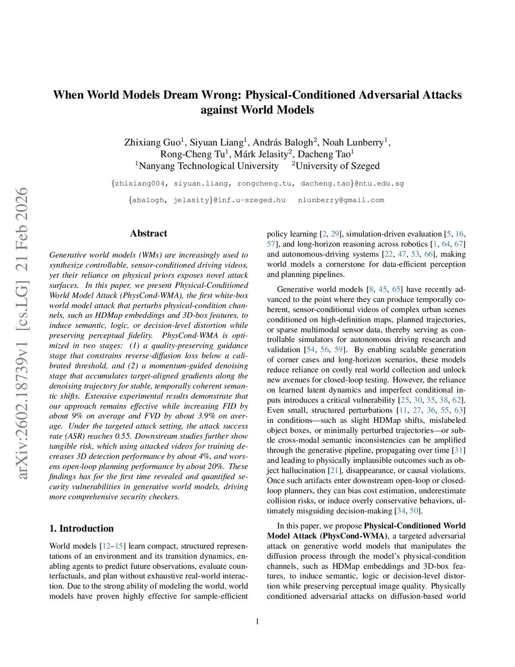 Generative world models (WMs) are increasingly used to synthesize controllable, sensor-conditioned driving videos, yet their reliance on physical priors exposes novel attack surfaces. In this paper, we present Physical-Conditioned World Model Attack (PhysCond-WMA), the first white-box world model attack that perturbs physical-condition channels, such as HDMap embeddings and 3D-box features, to induce semantic, logic, or decision-level distortion while preserving perceptual fidelity. PhysCond-WMA is optimized in two stages: (1) a quality-preserving guidance stage that constrains reverse-diffusion loss below a calibrated threshold, and (2) a momentum-guided denoising stage that accumulates target-aligned gradients along the denoising trajectory for stable, temporally coherent semantic shifts. Extensive experimental results demonstrate that our approach remains effective while increasing FID by about 9% on average and FVD by about 3.9% on average. Under the targeted attack setting, the attack success rate (ASR) reaches 0.55. Downstream studies further show tangible risk, which using attacked videos for training decreases 3D detection performance by about 4%, and worsens open-loop planning performance by about 20%. These findings has for the first time revealed and quantified security vulnerabilities in generative world models, driving more comprehensive security checkers.