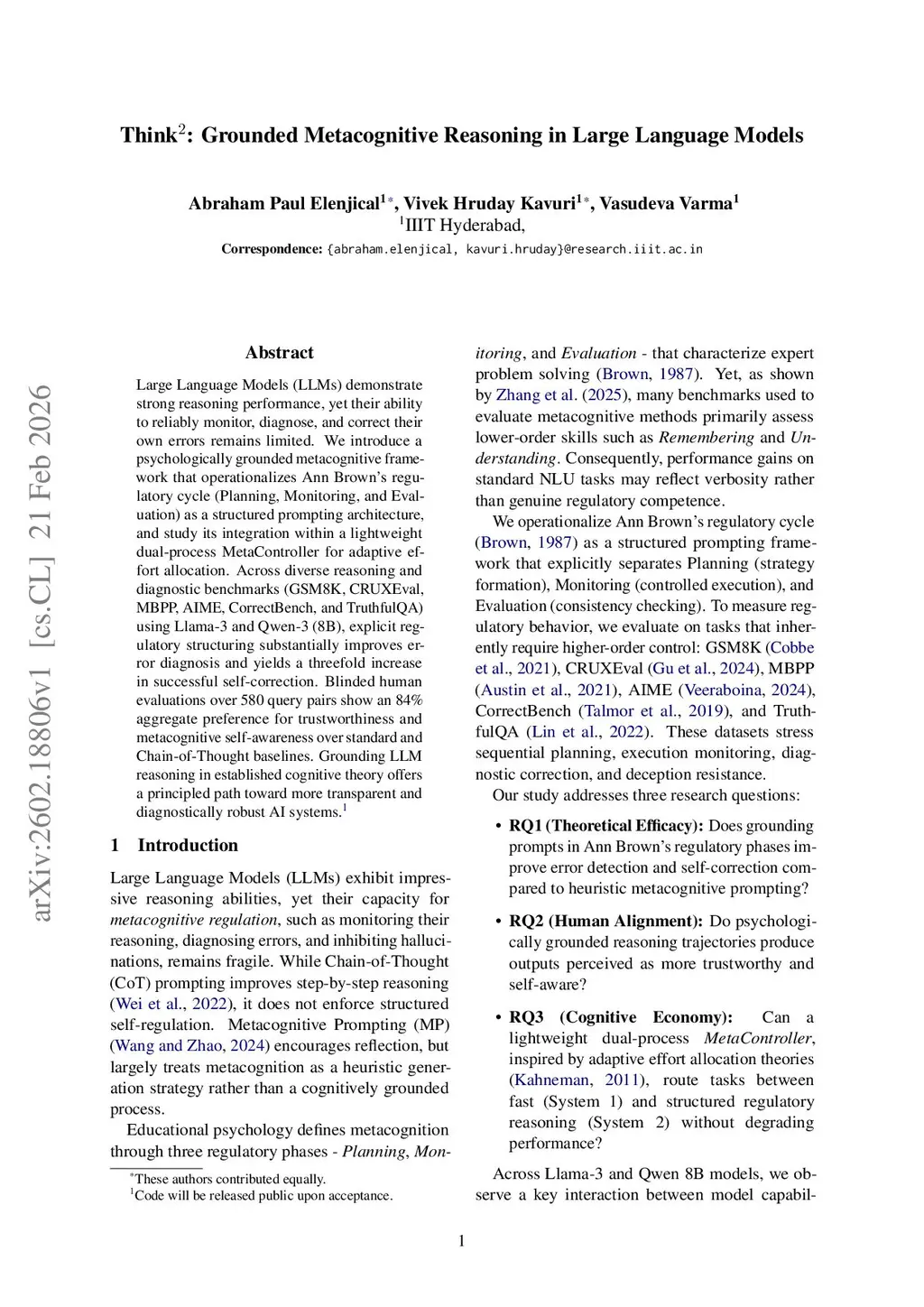 Think: Grounded Metacognitive Reasoning in Large Language Models