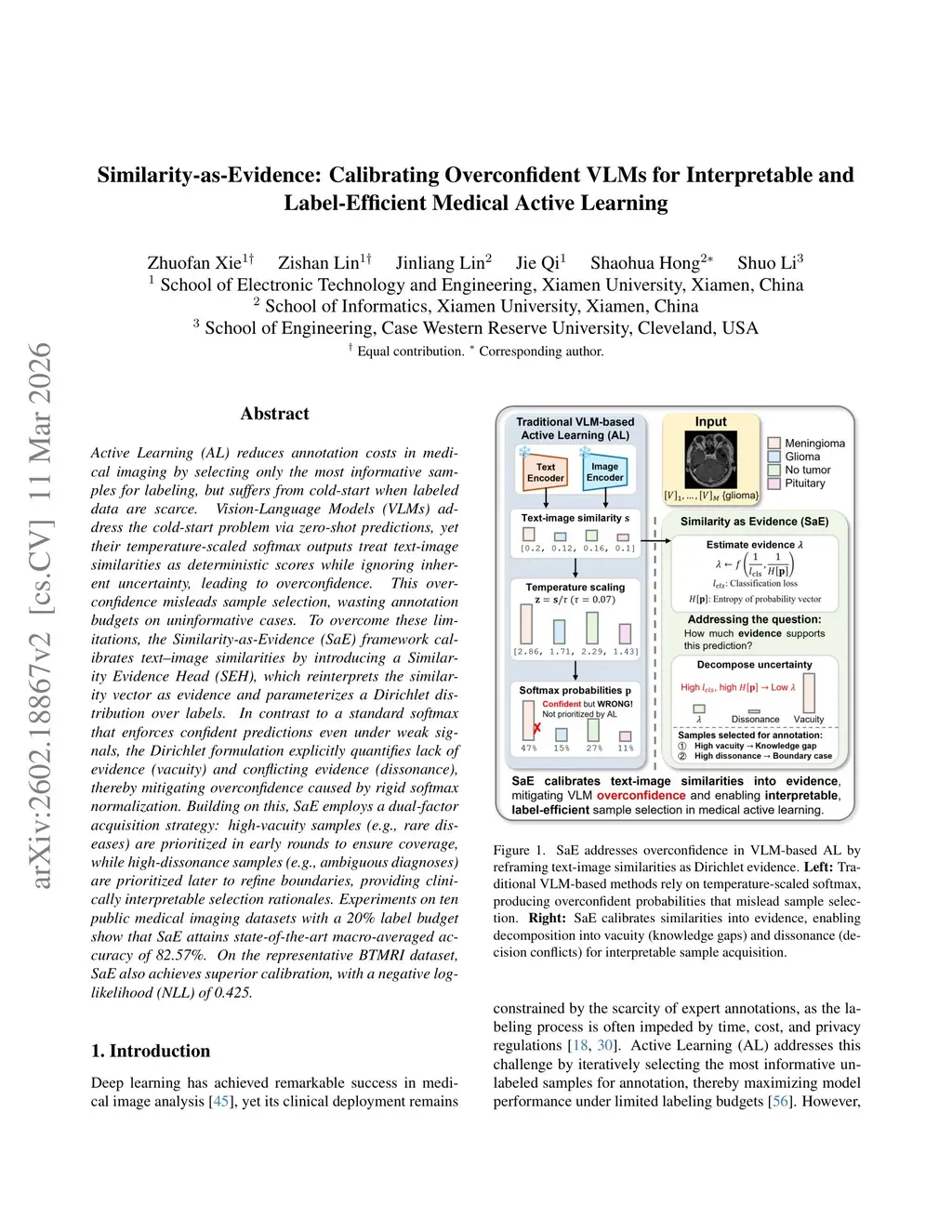 Active Learning (AL) reduces annotation costs in medical imaging by selecting only the most informative samples for labeling, but suffers from cold-start when labeled data are scarce. Vision-Language Models (VLMs) address the cold-start problem via zero-shot predictions, yet their temperature-scaled softmax outputs treat text-image similarities as deterministic scores while ignoring inherent uncertainty, leading to overconfidence. This overconfidence misleads sample selection, wasting annotation budgets on uninformative cases. To overcome these limitations, the Similarity-as-Evidence (SaE) framework calibrates text-image similarities by introducing a Similarity Evidence Head (SEH), which reinterprets the similarity vector as evidence and parameterizes a Dirichlet distribution over labels. In contrast to a standard softmax that enforces confident predictions even under weak signals, the Dirichlet formulation explicitly quantifies lack of evidence (vacuity) and conflicting evidence (dissonance), thereby mitigating overconfidence caused by rigid softmax normalization. Building on this, SaE employs a dual-factor acquisition strategy: high-vacuity samples (e.g., rare diseases) are prioritized in early rounds to ensure coverage, while high-dissonance samples (e.g., ambiguous diagnoses) are prioritized later to refine boundaries, providing clinically interpretable selection rationales. Experiments on ten public medical imaging datasets with a 20% label budget show that SaE attains state-of-the-art macro-averaged accuracy of 82.57%. On the representative BTMRI dataset, SaE also achieves superior calibration, with a negative log-likelihood (NLL) of 0.425.