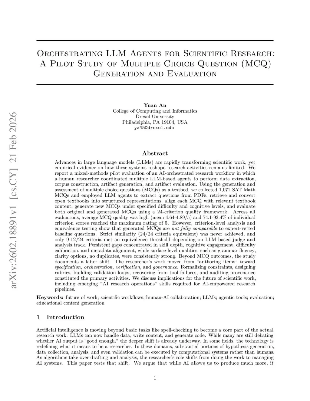 Advances in large language models (LLMs) are rapidly transforming scientific work, yet empirical evidence on how these systems reshape research activities remains limited. We report a mixed-methods pilot evaluation of an AI-orchestrated research workflow in which a human researcher coordinated multiple LLM-based agents to perform data extraction, corpus construction, artifact generation, and artifact evaluation. Using the generation and assessment of multiple-choice questions (MCQs) as a testbed, we collected 1,071 SAT Math MCQs and employed LLM agents to extract questions from PDFs, retrieve and convert open textbooks into structured representations, align each MCQ with relevant textbook content, generate new MCQs under specified difficulty and cognitive levels, and evaluate both original and generated MCQs using a 24-criterion quality framework. Across all evaluations, average MCQ quality was high. However, criterion-level analysis and equivalence testing show that generated MCQs are not fully comparable to expert-vetted baseline questions. Strict similarity (24/24 criteria equivalent) was never achieved. Persistent gaps concentrated in skill\ depth, cognitive engagement, difficulty calibration, and metadata alignment, while surface-level qualities, such as {grammar fluency}, {clarity options}, {no duplicates}, were consistently strong. Beyond MCQ outcomes, the study documents a labor shift. The researcher's work moved from ``authoring items'' toward {specification, orchestration, verification}, and {governance}. Formalizing constraints, designing rubrics, building validation loops, recovering from tool failures, and auditing provenance constituted the primary activities. We discuss implications for the future of scientific work, including emerging ``AI research operations'' skills required for AI-empowered research pipelines.
