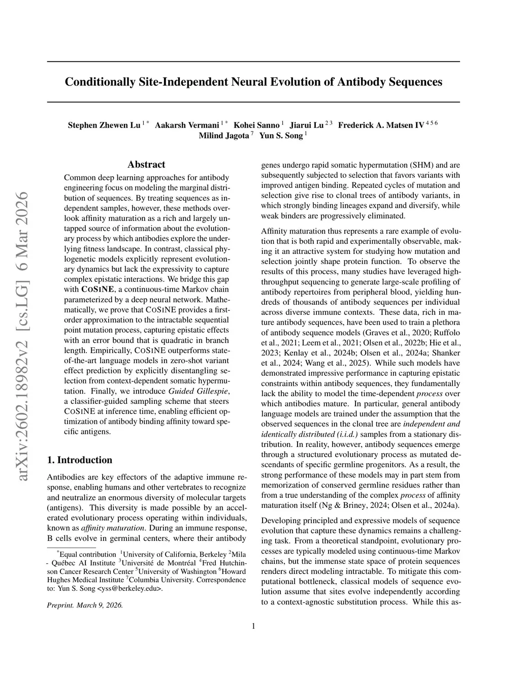 Common deep learning approaches for antibody engineering focus on modeling the marginal distribution of sequences. By treating sequences as independent samples, however, these methods overlook affinity maturation as a rich and largely untapped source of information about the evolutionary process by which antibodies explore the underlying fitness landscape. In contrast, classical phylogenetic models explicitly represent evolutionary dynamics but lack the expressivity to capture complex epistatic interactions. We bridge this gap with CoSiNE, a continuous-time Markov chain parameterized by a deep neural network. Mathematically, we prove that CoSiNE provides a first-order approximation to the intractable sequential point mutation process, capturing epistatic effects with an error bound that is quadratic in branch length. Empirically, CoSiNE outperforms state-of-the-art language models in zero-shot variant effect prediction by explicitly disentangling selection from context-dependent somatic hypermutation. Finally, we introduce Guided Gillespie, a classifier-guided sampling scheme that steers CoSiNE at inference time, enabling efficient optimization of antibody binding affinity toward specific antigens.
