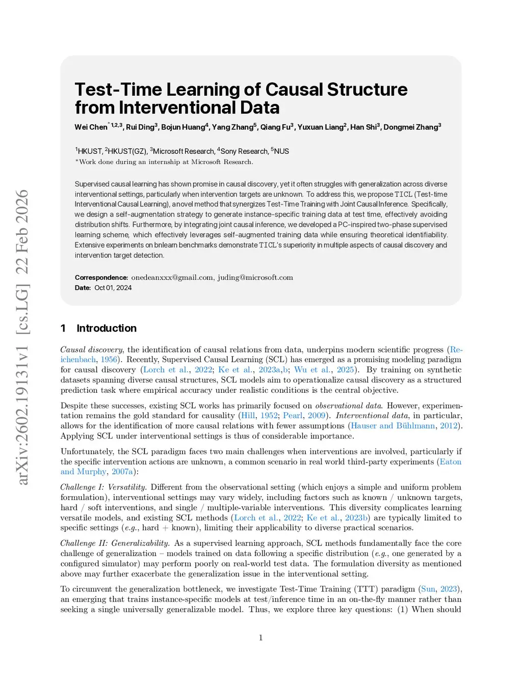 Supervised causal learning has shown promise in causal discovery, yet it often struggles with generalization across diverse interventional settings, particularly when intervention targets are unknown. To address this, we propose TICL (Test-time Interventional Causal Learning), a novel method that synergizes Test-Time Training with Joint Causal Inference. Specifically, we design a self-augmentation strategy to generate instance-specific training data at test time, effectively avoiding distribution shifts. Furthermore, by integrating joint causal inference, we developed a PC-inspired two-phase supervised learning scheme, which effectively leverages self-augmented training data while ensuring theoretical identifiability. Extensive experiments on bnlearn benchmarks demonstrate TICL's superiority in multiple aspects of causal discovery and intervention target detection.