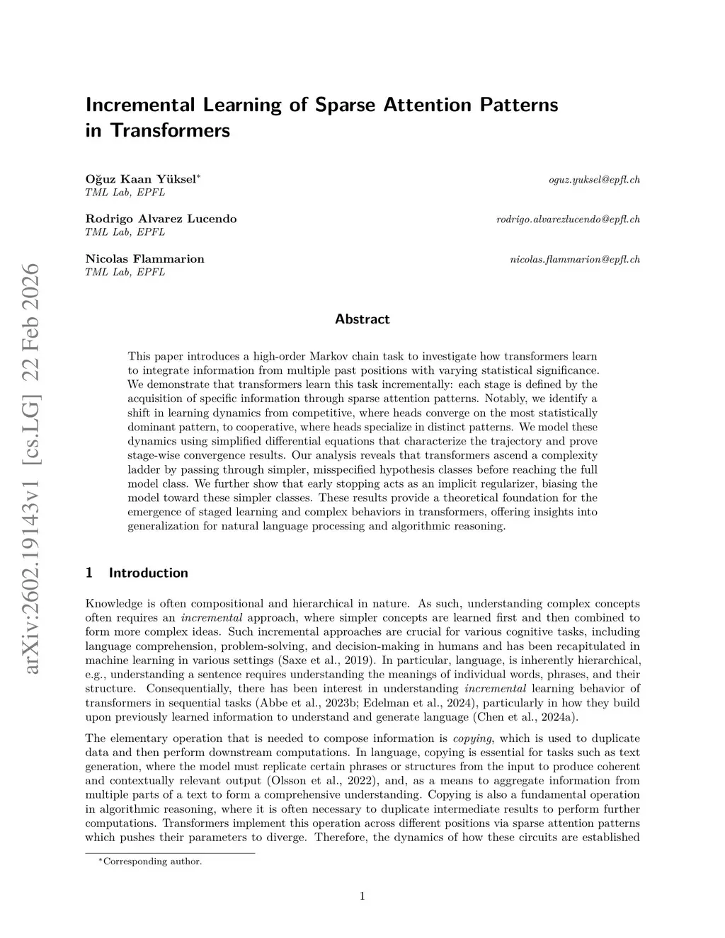 This paper introduces a high-order Markov chain task to investigate how transformers learn to integrate information from multiple past positions with varying statistical significance. We demonstrate that transformers learn this task incrementally: each stage is defined by the acquisition of specific information through sparse attention patterns. Notably, we identify a shift in learning dynamics from competitive, where heads converge on the most statistically dominant pattern, to cooperative, where heads specialize in distinct patterns. We model these dynamics using simplified differential equations that characterize the trajectory and prove stage-wise convergence results. Our analysis reveals that transformers ascend a complexity ladder by passing through simpler, misspecified hypothesis classes before reaching the full model class. We further show that early stopping acts as an implicit regularizer, biasing the model toward these simpler classes. These results provide a theoretical foundation for the emergence of staged learning and complex behaviors in transformers, offering insights into generalization for natural language processing and algorithmic reasoning.