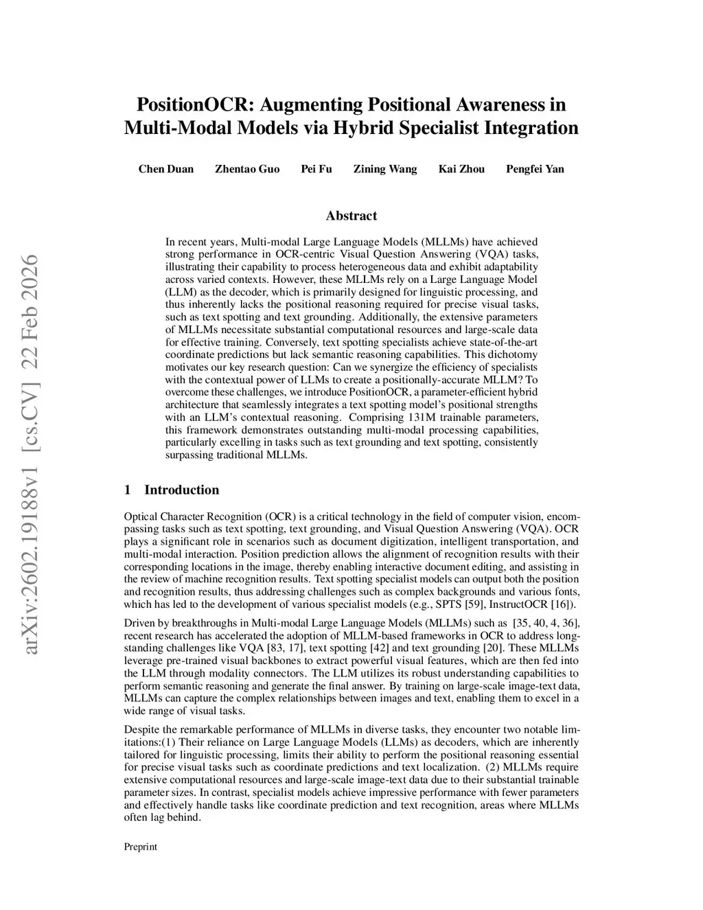 In recent years, Multi-modal Large Language Models (MLLMs) have achieved strong performance in OCR-centric Visual Question Answering (VQA) tasks, illustrating their capability to process heterogeneous data and exhibit adaptability across varied contexts. However, these MLLMs rely on a Large Language Model (LLM) as the decoder, which is primarily designed for linguistic processing, and thus inherently lacks the positional reasoning required for precise visual tasks, such as text spotting and text grounding. Additionally, the extensive parameters of MLLMs necessitate substantial computational resources and large-scale data for effective training. Conversely, text spotting specialists achieve state-of-the-art coordinate predictions but lack semantic reasoning capabilities. This dichotomy motivates our key research question: Can we synergize the efficiency of specialists with the contextual power of LLMs to create a positionally-accurate MLLM? To overcome these challenges, we introduce PositionOCR, a parameter-efficient hybrid architecture that seamlessly integrates a text spotting model's positional strengths with an LLM's contextual reasoning. Comprising 131M trainable parameters, this framework demonstrates outstanding multi-modal processing capabilities, particularly excelling in tasks such as text grounding and text spotting, consistently surpassing traditional MLLMs.
