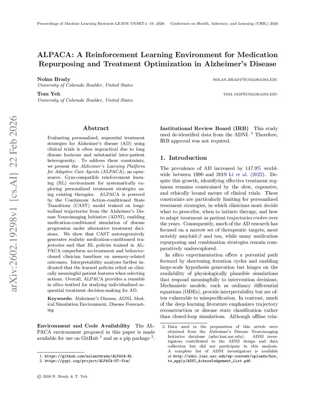 ALPACA: A Reinforcement Learning Environment for Medication Repurposing and Treatment Optimization in Alzheimer's Disease