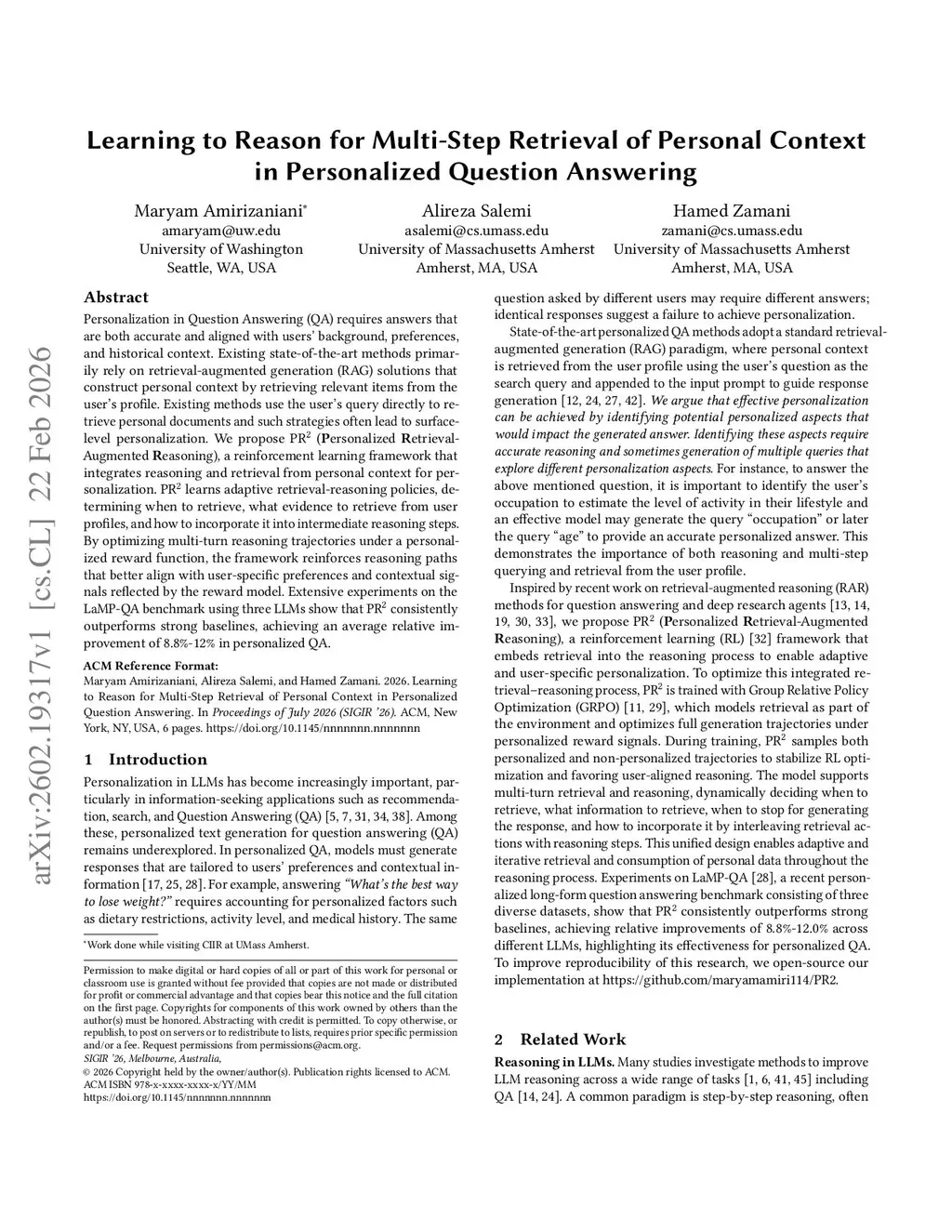 Learning to Reason for Multi-Step Retrieval of Personal Context in Personalized Question Answering