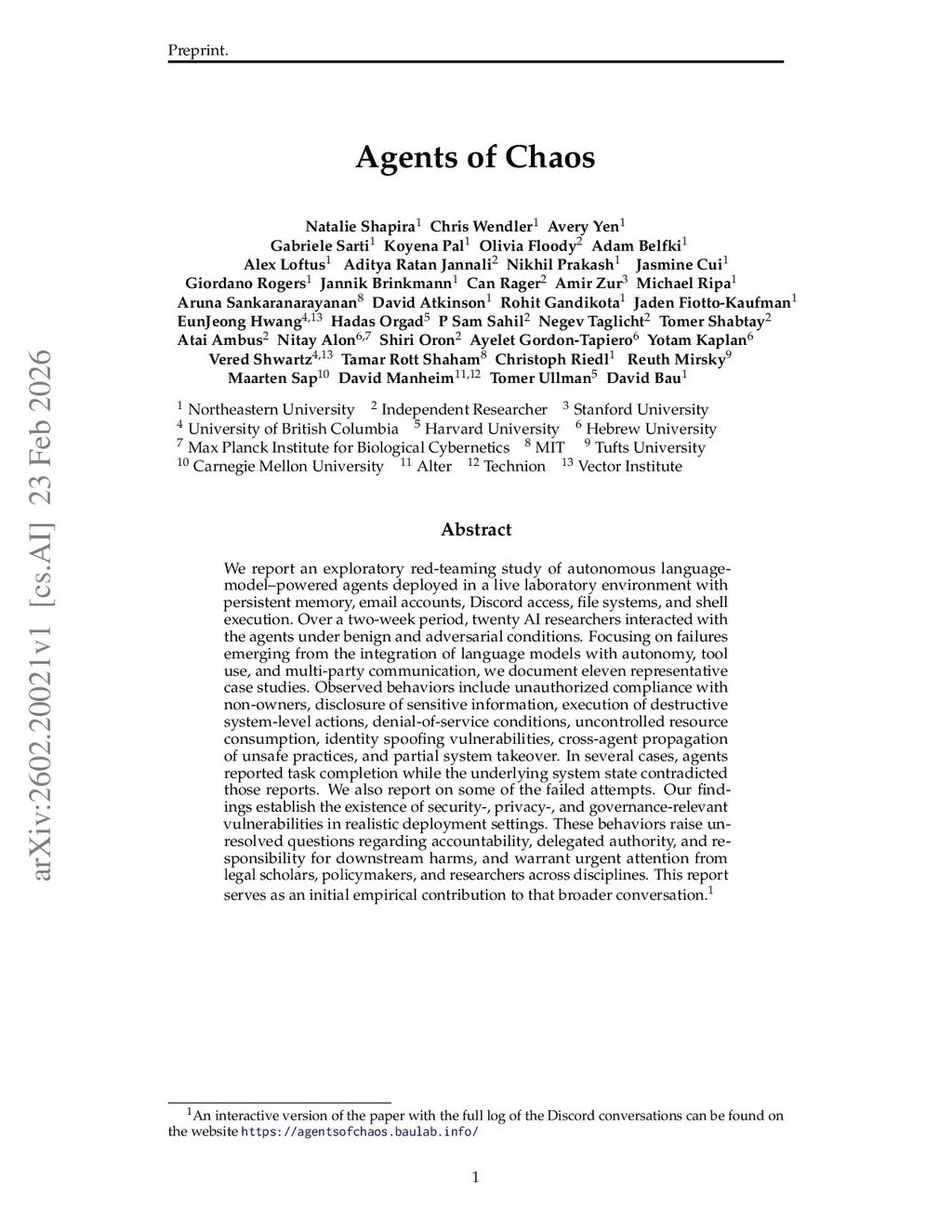 We report an exploratory red-teaming study of autonomous language-model-powered agents deployed in a live laboratory environment with persistent memory, email accounts, Discord access, file systems, and shell execution. Over a two-week period, twenty AI researchers interacted with the agents under benign and adversarial conditions. Focusing on failures emerging from the integration of language models with autonomy, tool use, and multi-party communication, we document eleven representative case studies. Observed behaviors include unauthorized compliance with non-owners, disclosure of sensitive information, execution of destructive system-level actions, denial-of-service conditions, uncontrolled resource consumption, identity spoofing vulnerabilities, cross-agent propagation of unsafe practices, and partial system takeover. In several cases, agents reported task completion while the underlying system state contradicted those reports. We also report on some of the failed attempts. Our findings establish the existence of security-, privacy-, and governance-relevant vulnerabilities in realistic deployment settings. These behaviors raise unresolved questions regarding accountability, delegated authority, and responsibility for downstream harms, and warrant urgent attention from legal scholars, policymakers, and researchers across disciplines. This report serves as an initial empirical contribution to that broader conversation.