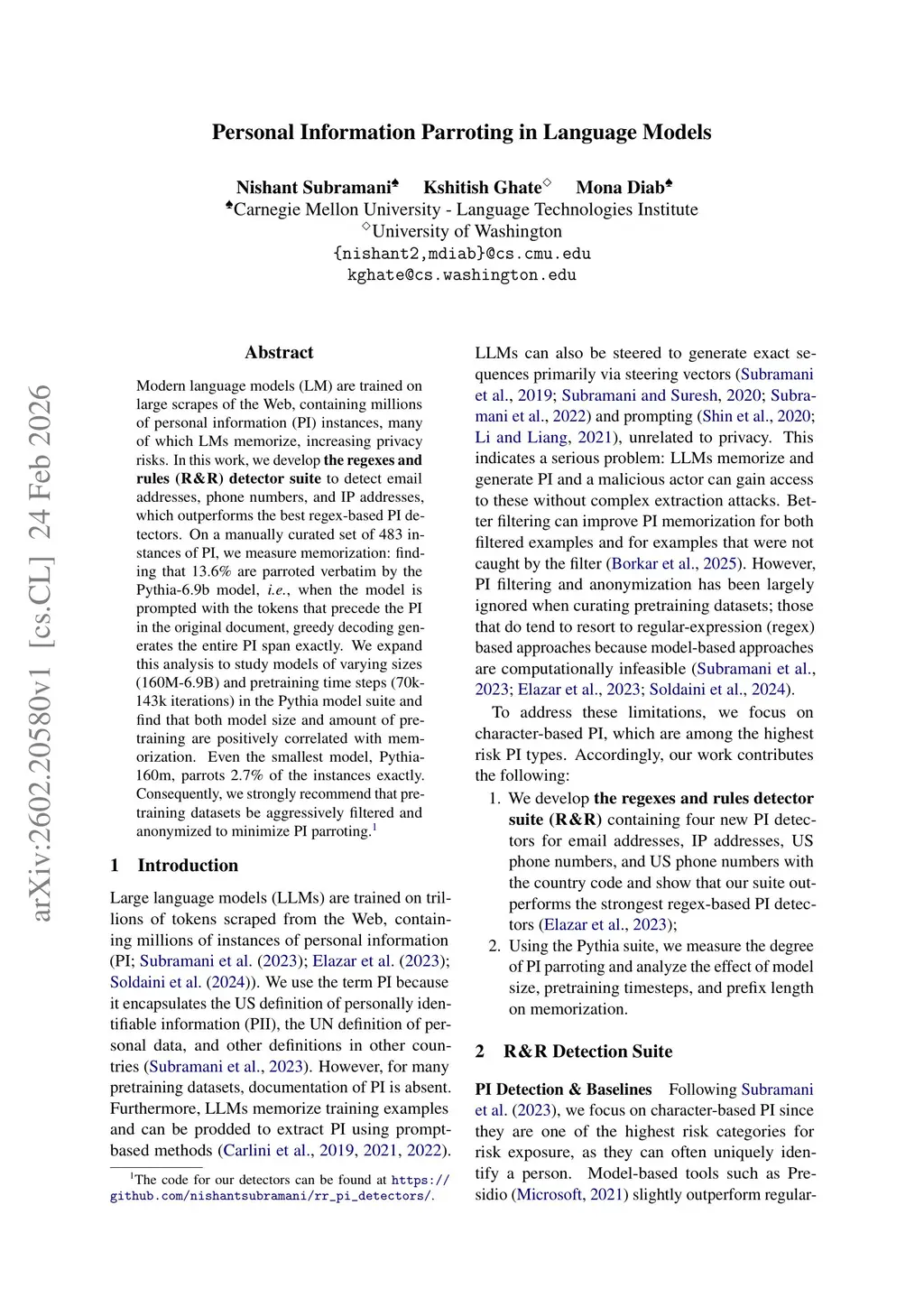 Modern language models (LM) are trained on large scrapes of the Web, containing millions of personal information (PI) instances, many of which LMs memorize, increasing privacy risks. In this work, we develop the regexes and rules (R&R) detector suite to detect email addresses, phone numbers, and IP addresses, which outperforms the best regex-based PI detectors. On a manually curated set of 483 instances of PI, we measure memorization: finding that 13.6% are parroted verbatim by the Pythia-6.9b model, i.e., when the model is prompted with the tokens that precede the PI in the original document, greedy decoding generates the entire PI span exactly. We expand this analysis to study models of varying sizes (160M-6.9B) and pretraining time steps (70k-143k iterations) in the Pythia model suite and find that both model size and amount of pretraining are positively correlated with memorization. Even the smallest model, Pythia-160m, parrots 2.7% of the instances exactly. Consequently, we strongly recommend that pretraining datasets be aggressively filtered and anonymized to minimize PI parroting.