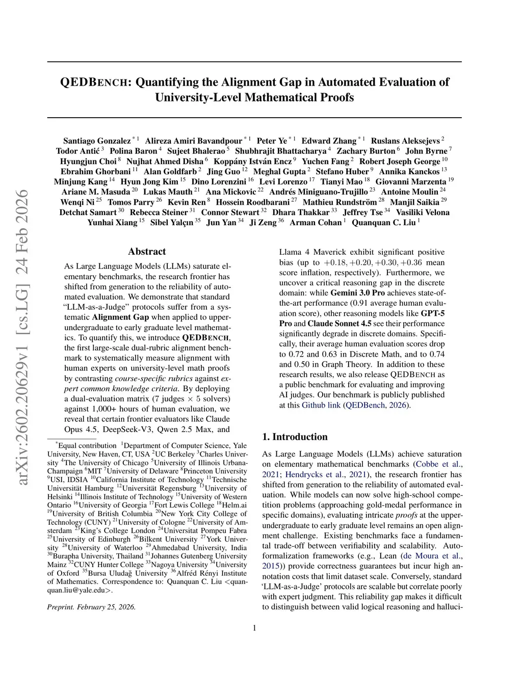 As Large Language Models (LLMs) saturate elementary benchmarks, the research frontier has shifted from generation to the reliability of automated evaluation. We demonstrate that standard "LLM-as-a-Judge" protocols suffer from a systematic Alignment Gap when applied to upper-undergraduate to early graduate level mathematics. To quantify this, we introduce QEDBench, the first large-scale dual-rubric alignment benchmark to systematically measure alignment with human experts on university-level math proofs by contrasting course-specific rubrics against expert common knowledge criteria. By deploying a dual-evaluation matrix (7 judges x 5 solvers) against 1,000+ hours of human evaluation, we reveal that certain frontier evaluators like Claude Opus 4.5, DeepSeek-V3, Qwen 2.5 Max, and Llama 4 Maverick exhibit significant positive bias (up to +0.18, +0.20, +0.30, +0.36 mean score inflation, respectively). Furthermore, we uncover a critical reasoning gap in the discrete domain: while Gemini 3.0 Pro achieves state-of-the-art performance (0.91 average human evaluation score), other reasoning models like GPT-5 Pro and Claude Sonnet 4.5 see their performance significantly degrade in discrete domains. Specifically, their average human evaluation scores drop to 0.72 and 0.63 in Discrete Math, and to 0.74 and 0.50 in Graph Theory. In addition to these research results, we also release QEDBench as a public benchmark for evaluating and improving AI judges. Our benchmark is publicly published atthis https URL.