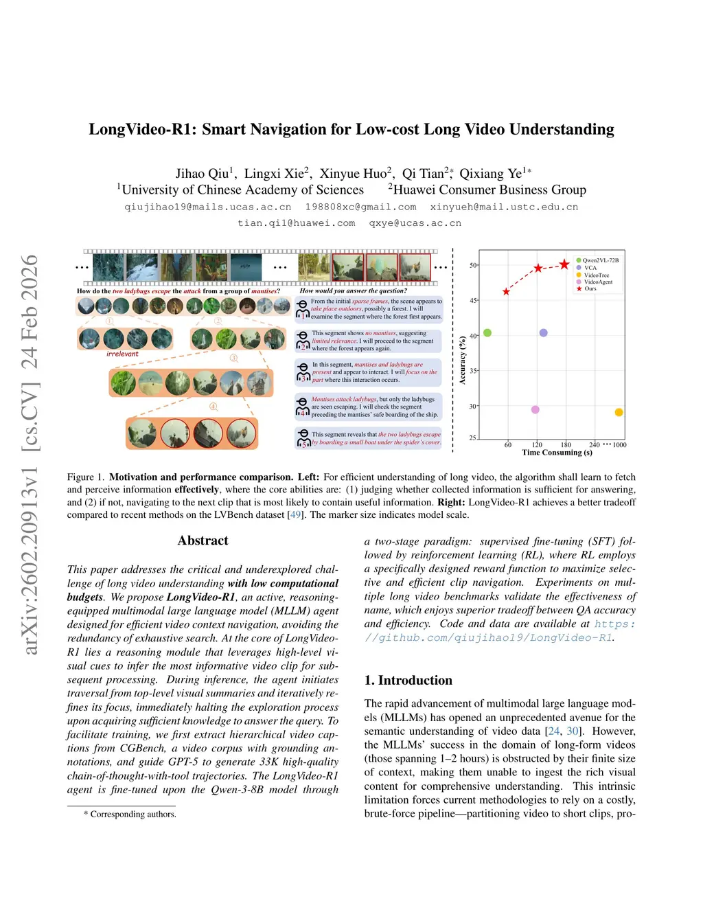 This paper addresses the critical and underexplored challenge of long video understanding with low computational budgets. We propose LongVideo-R1, an active, reasoning-equipped multimodal large language model (MLLM) agent designed for efficient video context navigation, avoiding the redundancy of exhaustive search. At the core of LongVideo-R1 lies a reasoning module that leverages high-level visual cues to infer the most informative video clip for subsequent processing. During inference, the agent initiates traversal from top-level visual summaries and iteratively refines its focus, immediately halting the exploration process upon acquiring sufficient knowledge to answer the query. To facilitate training, we first extract hierarchical video captions from CGBench, a video corpus with grounding annotations, and guide GPT-5 to generate 33K high-quality chain-of-thought-with-tool trajectories. The LongVideo-R1 agent is fine-tuned upon the Qwen-3-8B model through a two-stage paradigm: supervised fine-tuning (SFT) followed by reinforcement learning (RL), where RL employs a specifically designed reward function to maximize selective and efficient clip navigation. Experiments on multiple long video benchmarks validate the effectiveness of name, which enjoys superior tradeoff between QA accuracy and efficiency. All curated data and source code are provided in the supplementary material and will be made publicly available. Code and data are available at:this https URL
