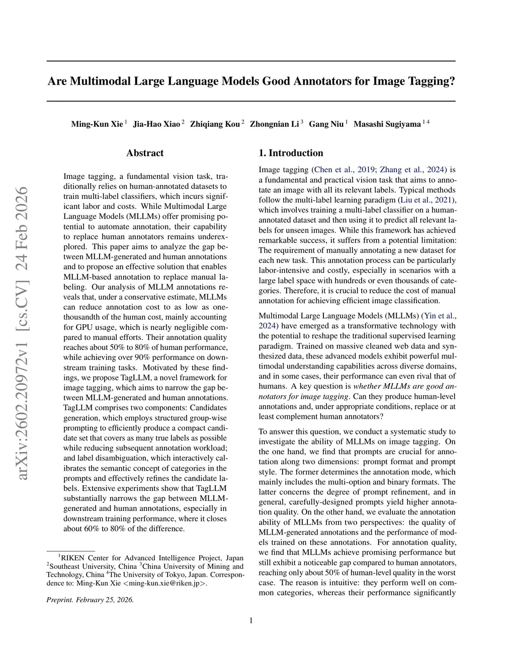 Image tagging, a fundamental vision task, traditionally relies on human-annotated datasets to train multi-label classifiers, which incurs significant labor and costs. While Multimodal Large Language Models (MLLMs) offer promising potential to automate annotation, their capability to replace human annotators remains underexplored. This paper aims to analyze the gap between MLLM-generated and human annotations and to propose an effective solution that enables MLLM-based annotation to replace manual labeling. Our analysis of MLLM annotations reveals that, under a conservative estimate, MLLMs can reduce annotation cost to as low as one-thousandth of the human cost, mainly accounting for GPU usage, which is nearly negligible compared to manual efforts. Their annotation quality reaches about 50\% to 80\% of human performance, while achieving over 90\% performance on downstream trainingthis http URLby these findings, we propose TagLLM, a novel framework for image tagging, which aims to narrow the gap between MLLM-generated and human annotations. TagLLM comprises two components: Candidates generation, which employs structured group-wise prompting to efficiently produce a compact candidate set that covers as many true labels as possible while reducing subsequent annotation workload; and label disambiguation, which interactively calibrates the semantic concept of categories in the prompts and effectively refines the candidate labels. Extensive experiments show that TagLLM substantially narrows the gap between MLLM-generated and human annotations, especially in downstream training performance, where it closes about 60\% to 80\% of the difference.