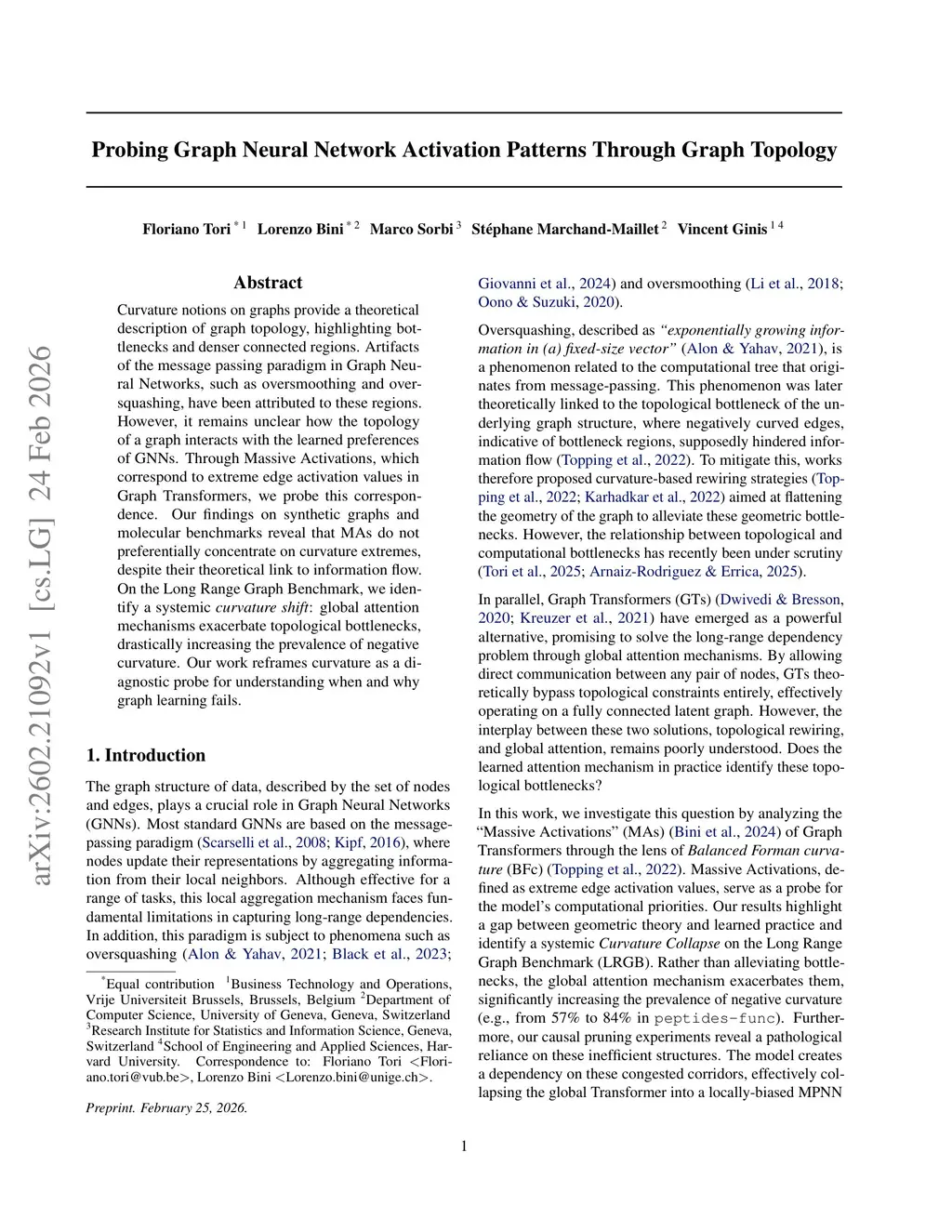 Curvature notions on graphs provide a theoretical description of graph topology, highlighting bottlenecks and denser connected regions. Artifacts of the message passing paradigm in Graph Neural Networks, such as oversmoothing and oversquashing, have been attributed to these regions. However, it remains unclear how the topology of a graph interacts with the learned preferences of GNNs. Through Massive Activations, which correspond to extreme edge activation values in Graph Transformers, we probe this correspondence. Our findings on synthetic graphs and molecular benchmarks reveal that MAs do not preferentially concentrate on curvature extremes, despite their theoretical link to information flow. On the Long Range Graph Benchmark, we identify a systemic \textit{curvature shift}: global attention mechanisms exacerbate topological bottlenecks, drastically increasing the prevalence of negative curvature. Our work reframes curvature as a diagnostic probe for understanding when and why graph learning fails.