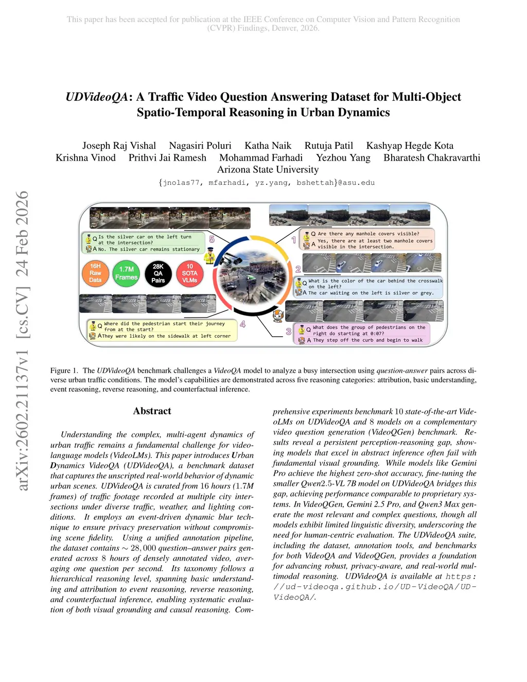 Understanding the complex, multi-agent dynamics of urban traffic remains a fundamental challenge for video language models. This paper introduces Urban Dynamics VideoQA, a benchmark dataset that captures the unscripted real-world behavior of dynamic urban scenes. UDVideoQA is curated from 16 hours of traffic footage recorded at multiple city intersections under diverse traffic, weather, and lighting conditions. It employs an event-driven dynamic blur technique to ensure privacy preservation without compromising scene fidelity. Using a unified annotation pipeline, the dataset contains 28K question-answer pairs generated across 8 hours of densely annotated video, averaging one question per second. Its taxonomy follows a hierarchical reasoning level, spanning basic understanding and attribution to event reasoning, reverse reasoning, and counterfactual inference, enabling systematic evaluation of both visual grounding and causal reasoning. Comprehensive experiments benchmark 10 SOTA VideoLMs on UDVideoQA and 8 models on a complementary video question generation benchmark. Results reveal a persistent perception-reasoning gap, showing models that excel in abstract inference often fail with fundamental visual grounding. While models like Gemini Pro achieve the highest zero-shot accuracy, fine-tuning the smaller Qwen2.5-VL 7B model on UDVideoQA bridges this gap, achieving performance comparable to proprietary systems. In VideoQGen, Gemini 2.5 Pro, and Qwen3 Max generate the most relevant and complex questions, though all models exhibit limited linguistic diversity, underscoring the need for human-centric evaluation. The UDVideoQA suite, including the dataset, annotation tools, and benchmarks for both VideoQA and VideoQGen, provides a foundation for advancing robust, privacy-aware, and real-world multimodal reasoning. UDVideoQA is available atthis https URL.