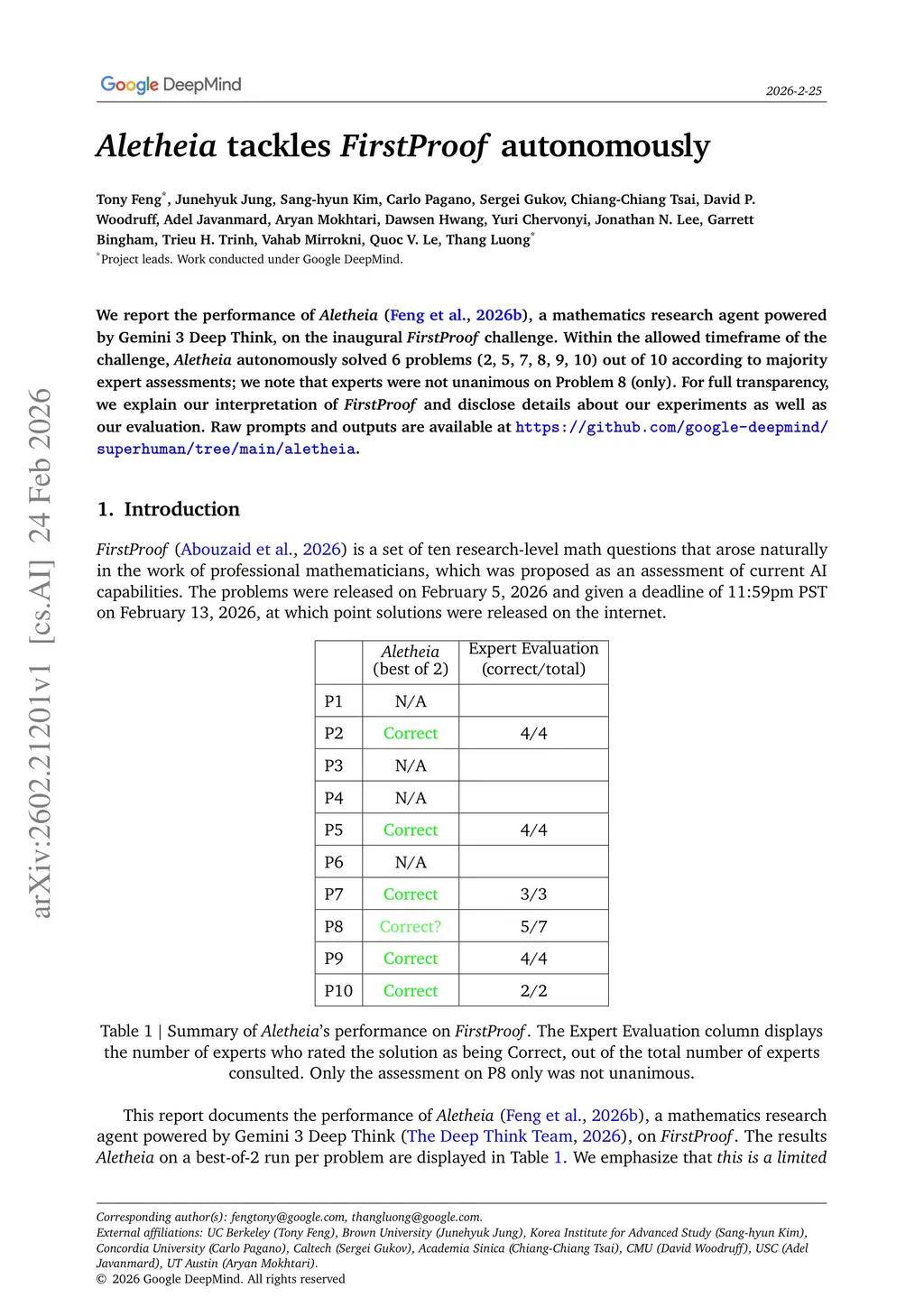 We report the performance of Aletheia (Feng et al., 2026b), a mathematics research agent powered by Gemini 3 Deep Think, on the inaugural FirstProof challenge. Within the allowed timeframe of the challenge, Aletheia autonomously solved 6 problems (2, 5, 7, 8, 9, 10) out of 10 according to majority expert assessments; we note that experts were not unanimous on Problem 8 (only). For full transparency, we explain our interpretation of FirstProof and disclose details about our experiments as well as our evaluation. Raw prompts and outputs are available atthis https URL.