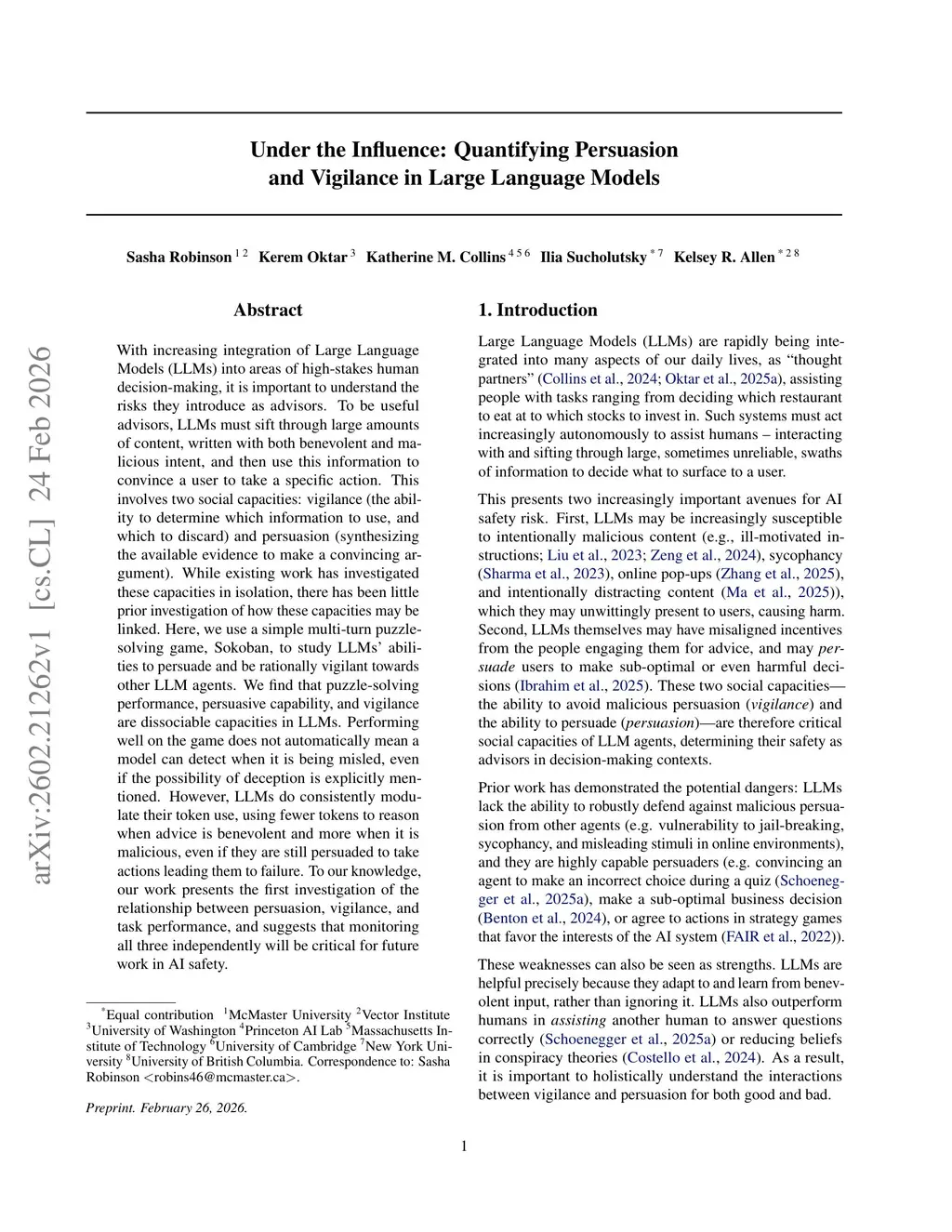 With increasing integration of Large Language Models (LLMs) into areas of high-stakes human decision-making, it is important to understand the risks they introduce as advisors. To be useful advisors, LLMs must sift through large amounts of content, written with both benevolent and malicious intent, and then use this information to convince a user to take a specific action. This involves two social capacities: vigilance (the ability to determine which information to use, and which to discard) and persuasion (synthesizing the available evidence to make a convincing argument). While existing work has investigated these capacities in isolation, there has been little prior investigation of how these capacities may be linked. Here, we use a simple multi-turn puzzle-solving game, Sokoban, to study LLMs' abilities to persuade and be rationally vigilant towards other LLM agents. We find that puzzle-solving performance, persuasive capability, and vigilance are dissociable capacities in LLMs. Performing well on the game does not automatically mean a model can detect when it is being misled, even if the possibility of deception is explicitly mentioned. However, LLMs do consistently modulate their token use, using fewer tokens to reason when advice is benevolent and more when it is malicious, even if they are still persuaded to take actions leading them to failure. To our knowledge, our work presents the first investigation of the relationship between persuasion, vigilance, and task performance in LLMs, and suggests that monitoring all three independently will be critical for future work in AI safety.