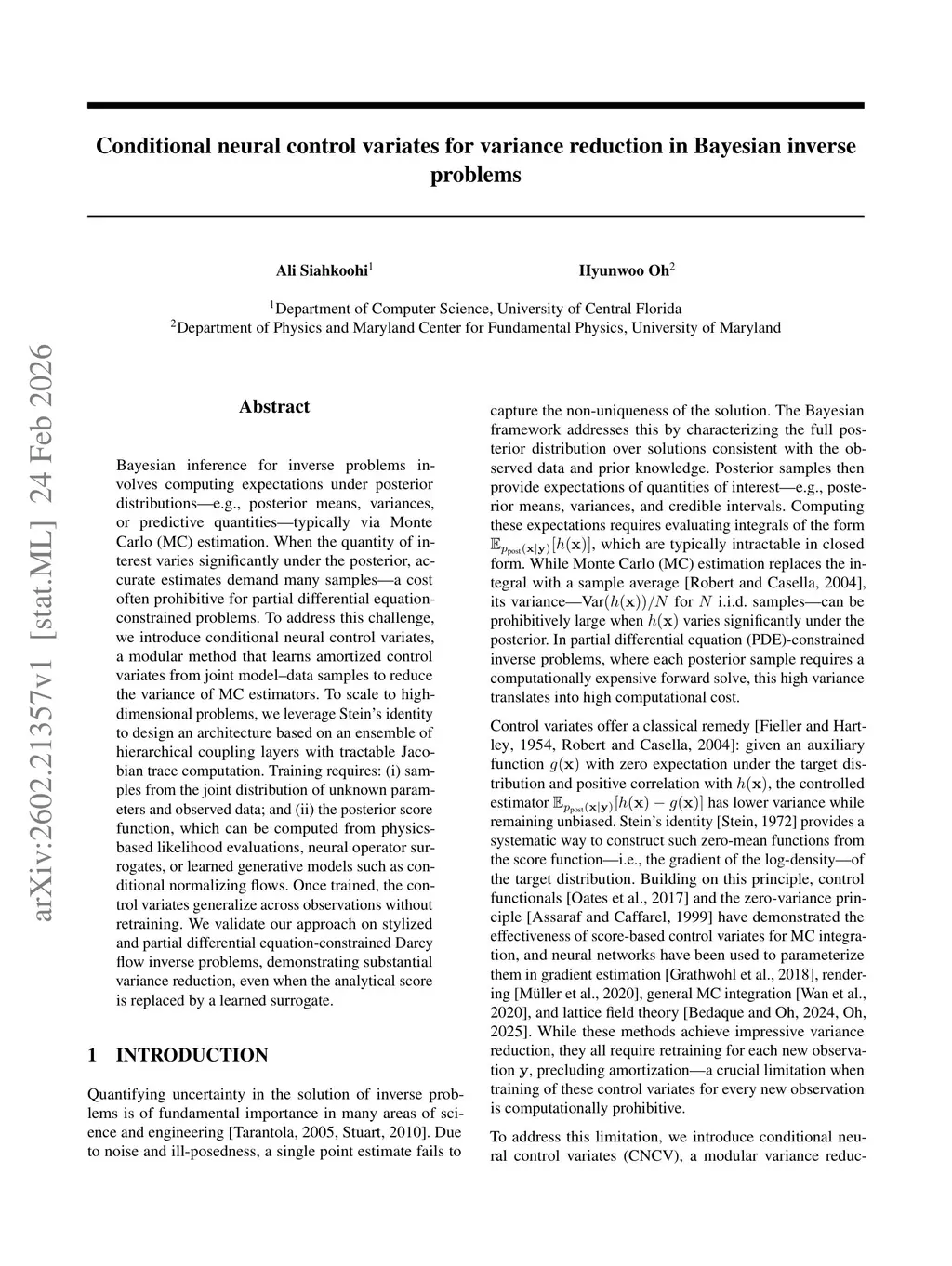 Bayesian inference for inverse problems involves computing expectations under posterior distributions -- e.g., posterior means, variances, or predictive quantities -- typically via Monte Carlo (MC) estimation. When the quantity of interest varies significantly under the posterior, accurate estimates demand many samples -- a cost often prohibitive for partial differential equation-constrained problems. To address this challenge, we introduce conditional neural control variates, a modular method that learns amortized control variates from joint model-data samples to reduce the variance of MC estimators. To scale to high-dimensional problems, we leverage Stein's identity to design an architecture based on an ensemble of hierarchical coupling layers with tractable Jacobian trace computation. Training requires: (i) samples from the joint distribution of unknown parameters and observed data; and (ii) the posterior score function, which can be computed from physics-based likelihood evaluations, neural operator surrogates, or learned generative models such as conditional normalizing flows. Once trained, the control variates generalize across observations without retraining. We validate our approach on stylized and partial differential equation-constrained Darcy flow inverse problems, demonstrating substantial variance reduction, even when the analytical score is replaced by a learned surrogate.