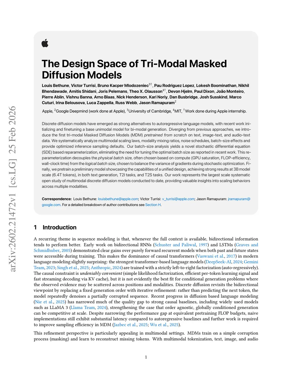 Discrete diffusion models have emerged as strong alternatives to autoregressive language models, with recent work initializing and fine-tuning a base unimodal model for bimodal generation. Diverging from previous approaches, we introduce the first tri-modal masked diffusion model pretrained from scratch on text, image-text, and audio-text data. We systematically analyze multimodal scaling laws, modality mixing ratios, noise schedules, and batch-size effects, and we provide optimized inference sampling defaults. Our batch-size analysis yields a novel stochastic differential equation (SDE)-based reparameterization that eliminates the need for tuning the optimal batch size as reported in recent work. This reparameterization decouples the physical batch size, often chosen based on compute constraints (GPU saturation, FLOP efficiency, wall-clock time), from the logical batch size, chosen to balance gradient variance during stochastic optimization. Finally, we pretrain a preliminary 3B-parameter tri-modal model on 6.4T tokens, demonstrating the capabilities of a unified design and achieving strong results in text generation, text-to-image tasks, and text-to-speech tasks. Our work represents the largest-scale systematic open study of multimodal discrete diffusion models conducted to date, providing insights into scaling behaviors across multiple modalities.