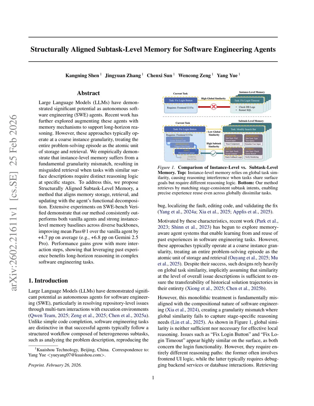 Large Language Models (LLMs) have demonstrated significant potential as autonomous software engineering (SWE) agents. Recent work has further explored augmenting these agents with memory mechanisms to support long-horizon reasoning. However, these approaches typically operate at a coarse instance granularity, treating the entire problem-solving episode as the atomic unit of storage and retrieval. We empirically demonstrate that instance-level memory suffers from a fundamental granularity mismatch, resulting in misguided retrieval when tasks with similar surface descriptions require distinct reasoning logic at specific stages. To address this, we propose Structurally Aligned Subtask-Level Memory, a method that aligns memory storage, retrieval, and updating with the agent's functional decomposition. Extensive experiments on SWE-bench Verified demonstrate that our method consistently outperforms both vanilla agents and strong instance-level memory baselines across diverse backbones, improving mean Pass@1 over the vanilla agent by +4.7 pp on average (e.g., +6.8 pp on Gemini 2.5 Pro). Performance gains grow with more interaction steps, showing that leveraging past experience benefits long-horizon reasoning in complex software engineering tasks.