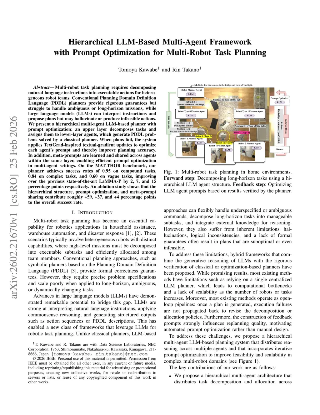 Hierarchical LLM-Based Multi-Agent Framework with Prompt Optimization for Multi-Robot Task Planning
