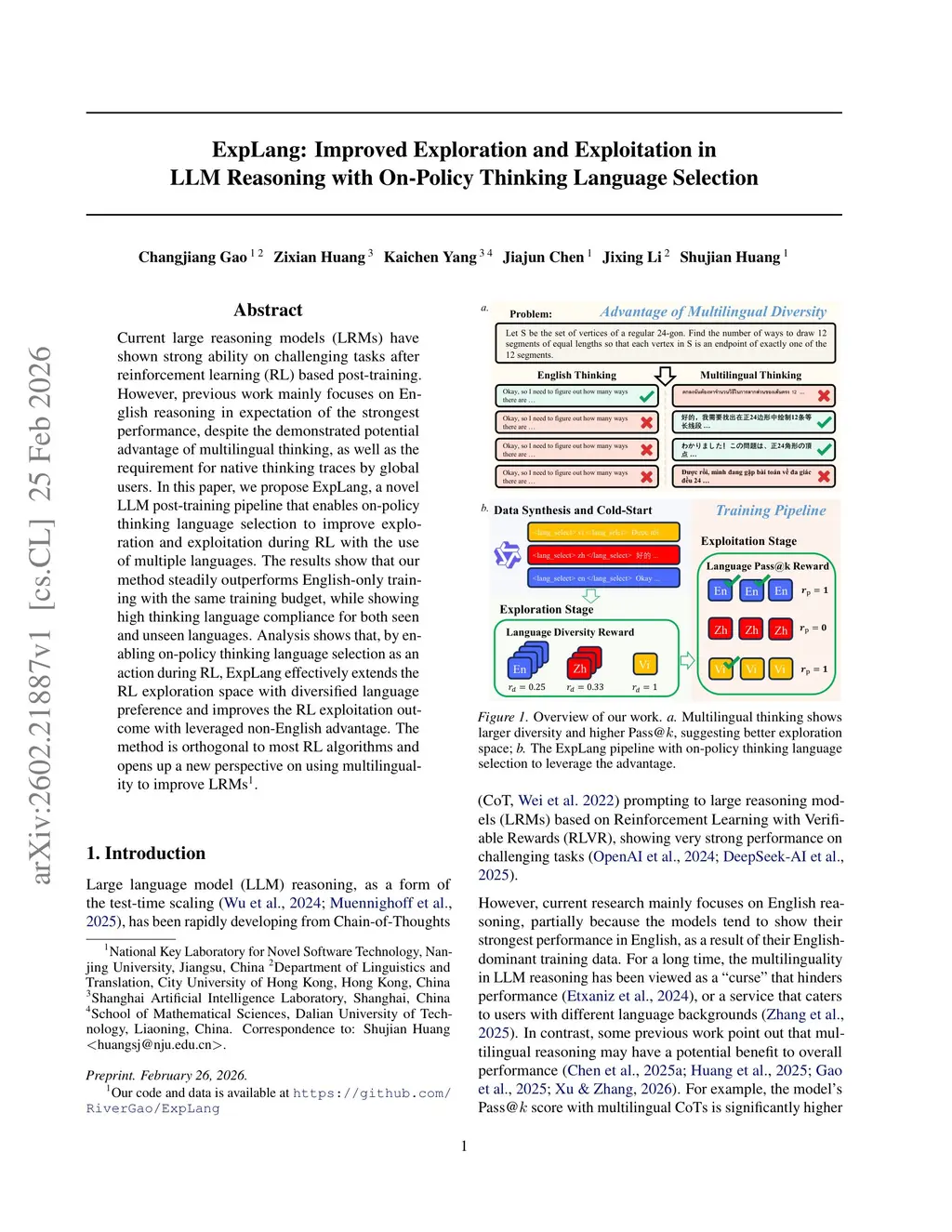 ExpLang: Improved Exploration and Exploitation in LLM Reasoning with On-Policy Thinking Language Selection