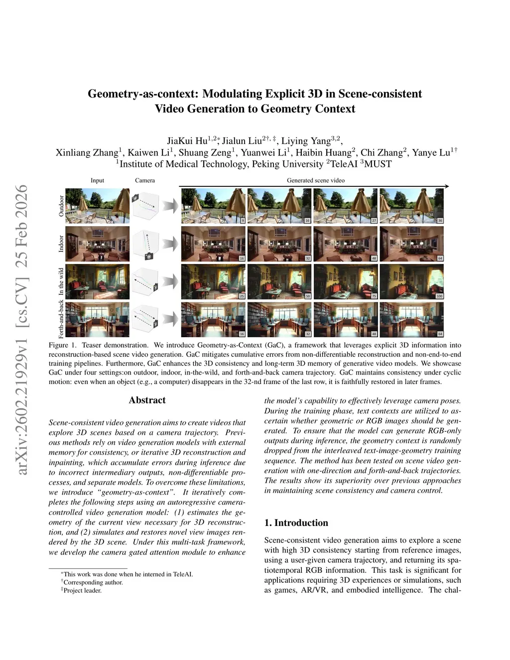 Scene-consistent video generation aims to create videos that explore 3D scenes based on a camera trajectory. Previous methods rely on video generation models with external memory for consistency, or iterative 3D reconstruction and inpainting, which accumulate errors during inference due to incorrect intermediary outputs, non-differentiable processes, and separate models. To overcome these limitations, we introduce ``geometry-as-context". It iteratively completes the following steps using an autoregressive camera-controlled video generation model: (1) estimates the geometry of the current view necessary for 3D reconstruction, and (2) simulates and restores novel view images rendered by the 3D scene. Under this multi-task framework, we develop the camera gated attention module to enhance the model's capability to effectively leverage camera poses. During the training phase, text contexts are utilized to ascertain whether geometric or RGB images should be generated. To ensure that the model can generate RGB-only outputs during inference, the geometry context is randomly dropped from the interleaved text-image-geometry training sequence. The method has been tested on scene video generation with one-direction and forth-and-back trajectories. The results show its superiority over previous approaches in maintaining scene consistency and camera control.