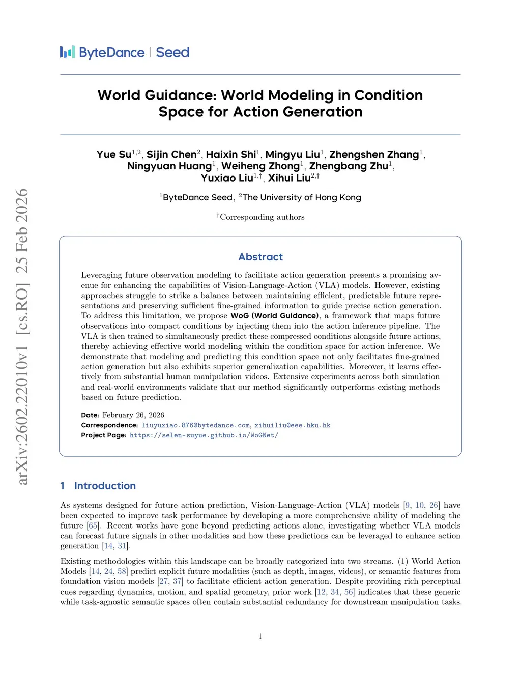 Leveraging future observation modeling to facilitate action generation presents a promising avenue for enhancing the capabilities of Vision-Language-Action (VLA) models. However, existing approaches struggle to strike a balance between maintaining efficient, predictable future representations and preserving sufficient fine-grained information to guide precise action generation. To address this limitation, we propose WoG (World Guidance), a framework that maps future observations into compact conditions by injecting them into the action inference pipeline. The VLA is then trained to simultaneously predict these compressed conditions alongside future actions, thereby achieving effective world modeling within the condition space for action inference. We demonstrate that modeling and predicting this condition space not only facilitates fine-grained action generation but also exhibits superior generalization capabilities. Moreover, it learns effectively from substantial human manipulation videos. Extensive experiments across both simulation and real-world environments validate that our method significantly outperforms existing methods based on future prediction. Project page is available at:this https URL