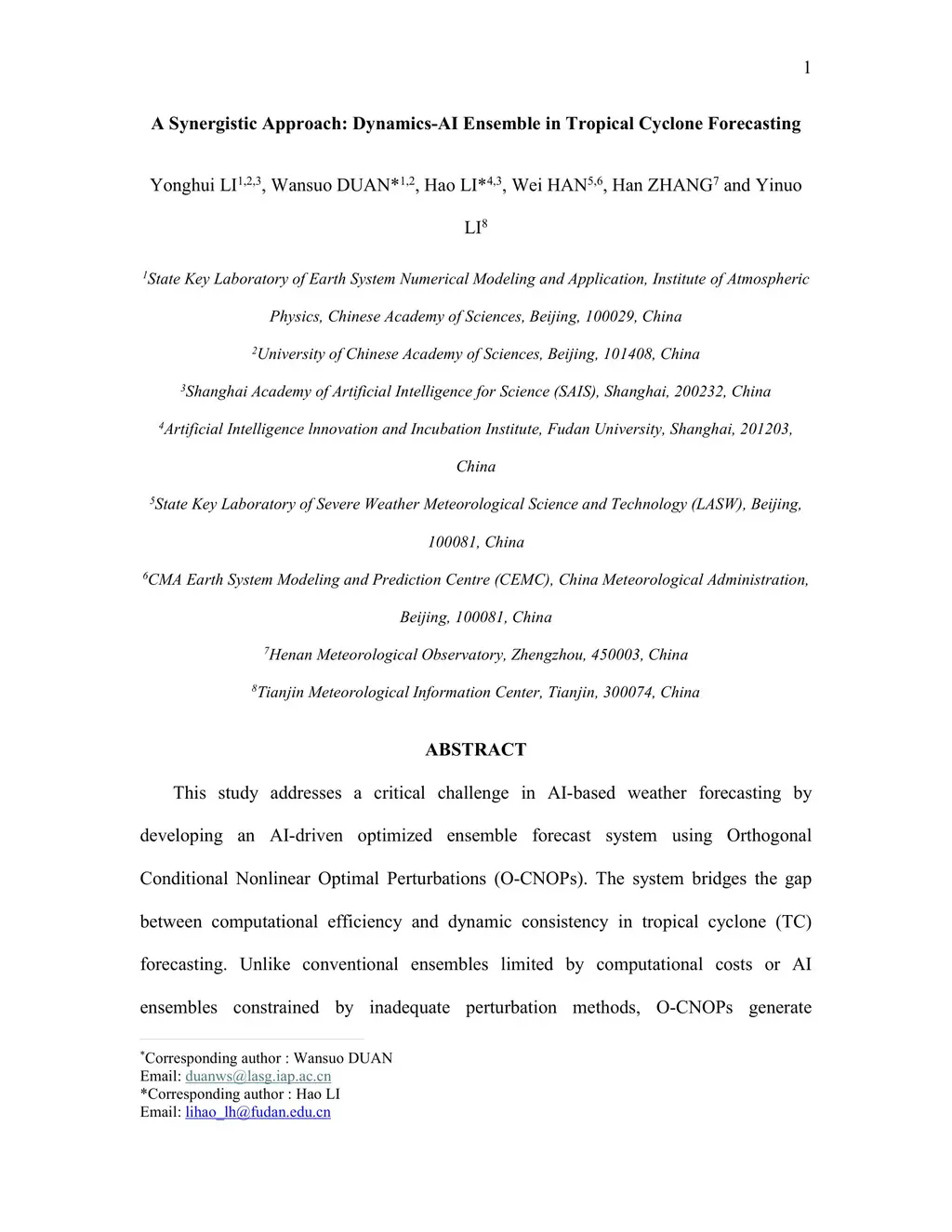 This study addresses a critical challenge in AI-based weather forecasting by developing an AI-driven optimized ensemble forecast system using Orthogonal Conditional Nonlinear Optimal Perturbations (O-CNOPs). The system bridges the gap between computational efficiency and dynamic consistency in tropical cyclone (TC) forecasting. Unlike conventional ensembles limited by computational costs or AI ensembles constrained by inadequate perturbation methods, O-CNOPs generate dynamically optimized perturbations that capture fast-growing errors of FuXi model while maintaining plausibility. The key innovation lies in producing orthogonal perturbations that respect FuXi nonlinear dynamics, yielding structures reflecting dominant dynamical controls and physically interpretable probabilistic forecasts. Demonstrating superior deterministic and probabilistic skills over the operational Integrated Forecasting System Ensemble Prediction System, this work establishes a new paradigm combining AI computational advantages with rigorous dynamical constraints. Success in TC track forecasting paves the way for reliable ensemble forecasts of other high-impact weather systems, marking a major step toward operational AI-based ensemble forecasting.