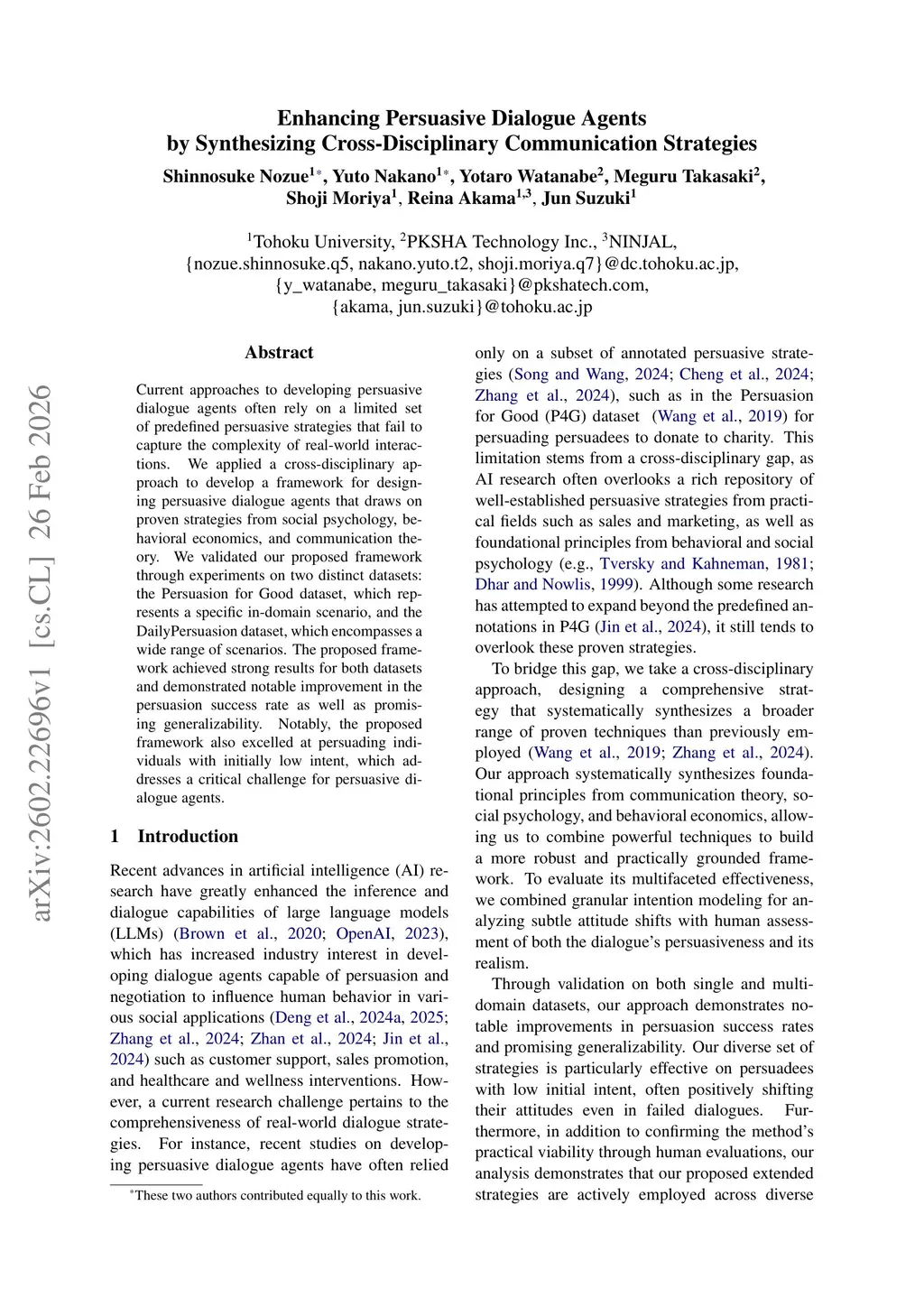 Current approaches to developing persuasive dialogue agents often rely on a limited set of predefined persuasive strategies that fail to capture the complexity of real-world interactions. We applied a cross-disciplinary approach to develop a framework for designing persuasive dialogue agents that draws on proven strategies from social psychology, behavioral economics, and communication theory. We validated our proposed framework through experiments on two distinct datasets: the Persuasion for Good dataset, which represents a specific in-domain scenario, and the DailyPersuasion dataset, which encompasses a wide range of scenarios. The proposed framework achieved strong results for both datasets and demonstrated notable improvement in the persuasion success rate as well as promising generalizability. Notably, the proposed framework also excelled at persuading individuals with initially low intent, which addresses a critical challenge for persuasive dialogue agents.