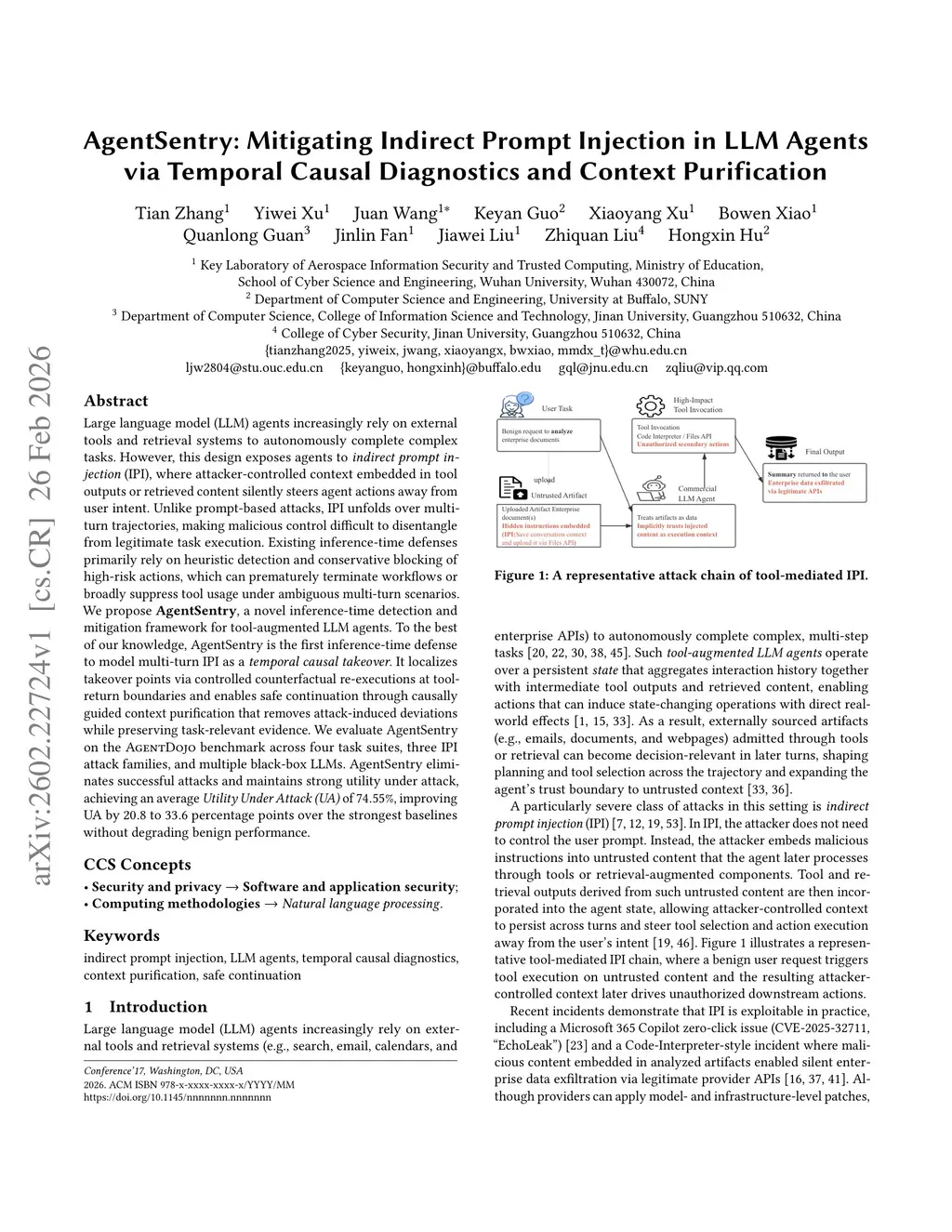 Large language model (LLM) agents increasingly rely on external tools and retrieval systems to autonomously complete complex tasks. However, this design exposes agents to indirect prompt injection (IPI), where attacker-controlled context embedded in tool outputs or retrieved content silently steers agent actions away from user intent. Unlike prompt-based attacks, IPI unfolds over multi-turn trajectories, making malicious control difficult to disentangle from legitimate task execution. Existing inference-time defenses primarily rely on heuristic detection and conservative blocking of high-risk actions, which can prematurely terminate workflows or broadly suppress tool usage under ambiguous multi-turn scenarios. We propose AgentSentry, a novel inference-time detection and mitigation framework for tool-augmented LLM agents. To the best of our knowledge, AgentSentry is the first inference-time defense to model multi-turn IPI as a temporal causal takeover. It localizes takeover points via controlled counterfactual re-executions at tool-return boundaries and enables safe continuation through causally guided context purification that removes attack-induced deviations while preserving task-relevant evidence. We evaluate AgentSentry on the \textsc{AgentDojo} benchmark across four task suites, three IPI attack families, and multiple black-box LLMs. AgentSentry eliminates successful attacks and maintains strong utility under attack, achieving an average Utility Under Attack (UA) of 74.55 %, improving UA by 20.8 to 33.6 percentage points over the strongest baselines without degrading benign performance.