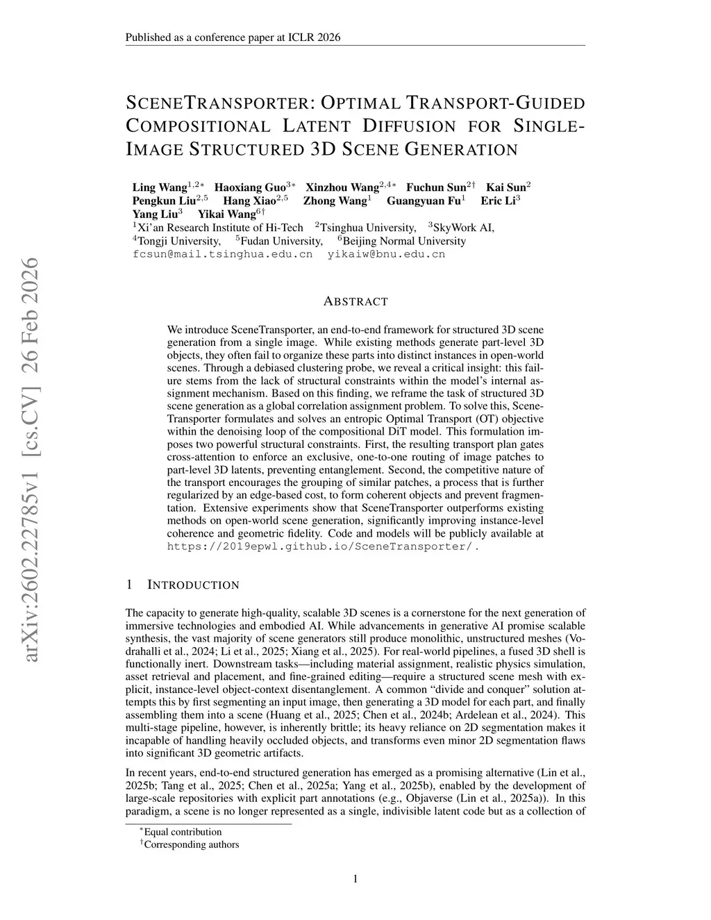 We introduce SceneTransporter, an end-to-end framework for structured 3D scene generation from a single image. While existing methods generate part-level 3D objects, they often fail to organize these parts into distinct instances in open-world scenes. Through a debiased clustering probe, we reveal a critical insight: this failure stems from the lack of structural constraints within the model's internal assignment mechanism. Based on this finding, we reframe the task of structured 3D scene generation as a global correlation assignment problem. To solve this, SceneTransporter formulates and solves an entropic Optimal Transport (OT) objective within the denoising loop of the compositional DiT model. This formulation imposes two powerful structural constraints. First, the resulting transport plan gates cross-attention to enforce an exclusive, one-to-one routing of image patches to part-level 3D latents, preventing entanglement. Second, the competitive nature of the transport encourages the grouping of similar patches, a process that is further regularized by an edge-based cost, to form coherent objects and prevent fragmentation. Extensive experiments show that SceneTransporter outperforms existing methods on open-world scene generation, significantly improving instance-level coherence and geometric fidelity. Code and models will be publicly available atthis https URL.
