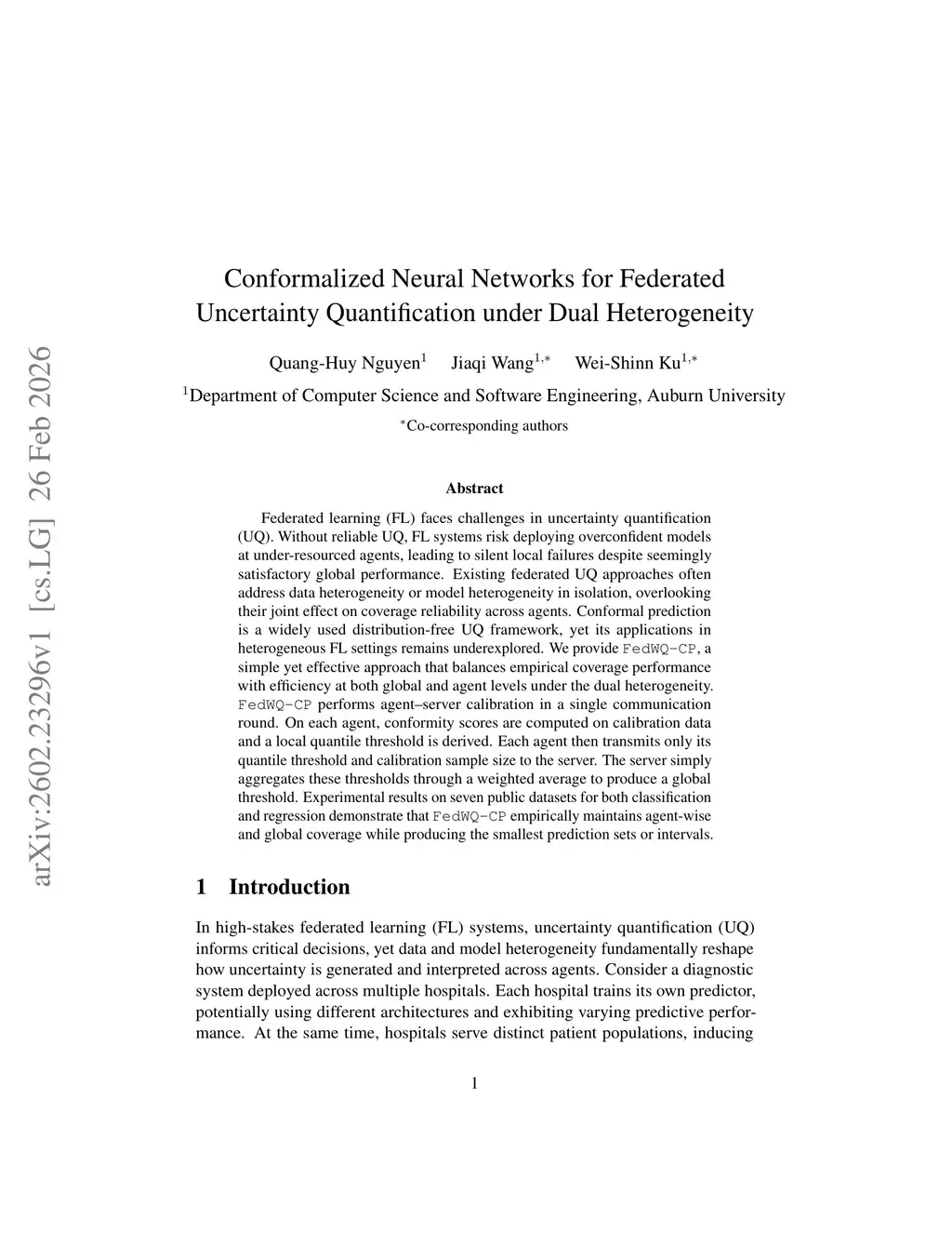 Federated learning (FL) faces challenges in uncertainty quantification (UQ). Without reliable UQ, FL systems risk deploying overconfident models at under-resourced agents, leading to silent local failures despite seemingly satisfactory global performance. Existing federated UQ approaches often address data heterogeneity or model heterogeneity in isolation, overlooking their joint effect on coverage reliability across agents. Conformal prediction is a widely used distribution-free UQ framework, yet its applications in heterogeneous FL settings remains underexplored. We provide FedWQ-CP, a simple yet effective approach that balances empirical coverage performance with efficiency at both global and agent levels under the dual heterogeneity. FedWQ-CP performs agent-server calibration in a single communication round. On each agent, conformity scores are computed on calibration data and a local quantile threshold is derived. Each agent then transmits only its quantile threshold and calibration sample size to the server. The server simply aggregates these thresholds through a weighted average to produce a global threshold. Experimental results on seven public datasets for both classification and regression demonstrate that FedWQ-CP empirically maintains agent-wise and global coverage while producing the smallest prediction sets or intervals.