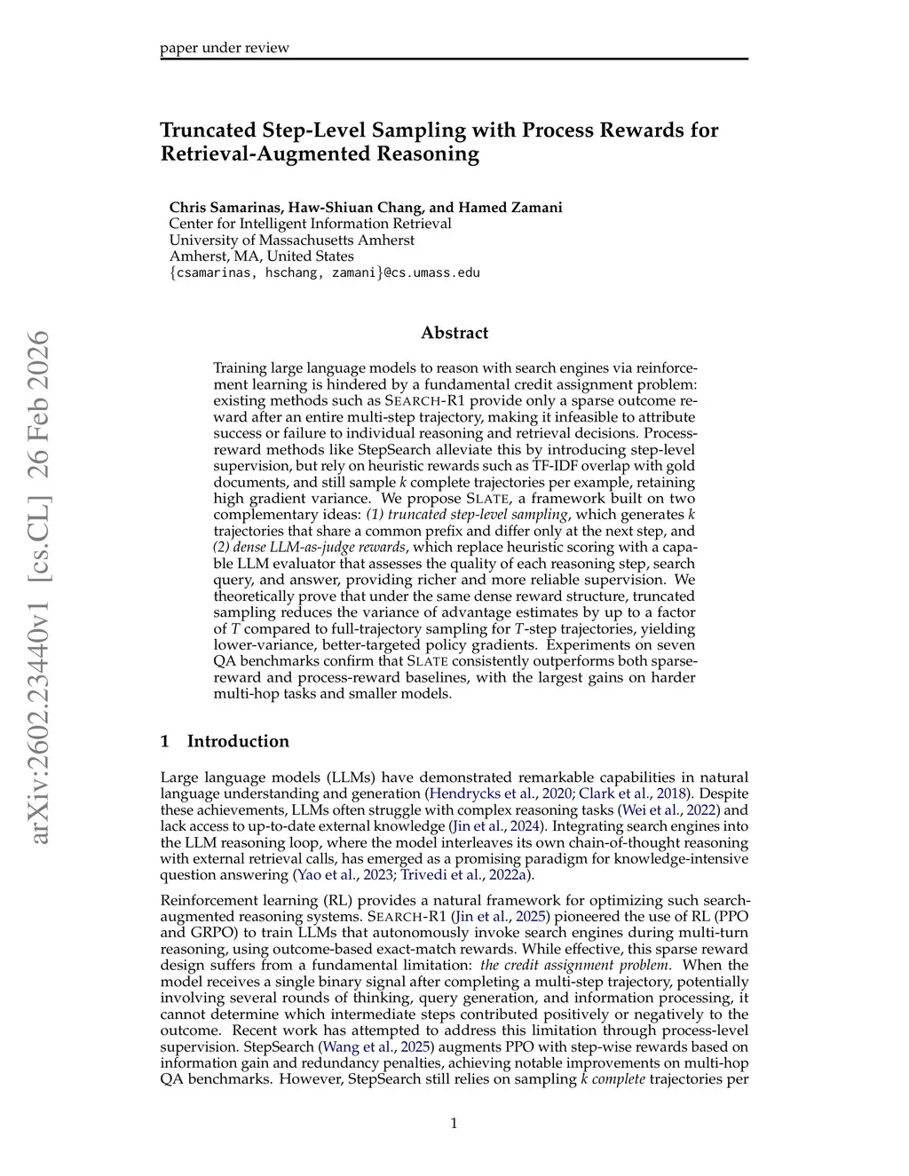 Reinforcement learning has emerged as an effective paradigm for training large language models to interleave reasoning with search engine calls. However, existing approaches face a fundamental credit assignment problem: methods like Search-R1 assign a single outcome reward to the entire multi-step trajectory, providing no signal about which reasoning or retrieval decisions were responsible for success or failure. Process-reward methods such as StepSearch introduce step-level supervision but still sample complete trajectories independently, so advantage estimates at any given step are contaminated by the randomness of all other steps. We propose SLATE (Step-Level Advantage estimation for Truncated Exploration), which addresses both problems through two complementary ideas. First, truncated step-level sampling generates k continuations from a shared prefix, isolating all variation to a single decision point. We prove this reduces the variance of advantage estimates by up to a factor of T compared to full-trajectory sampling for T-step trajectories, the first formal variance guarantee for step-level RL in retrieval-augmented reasoning. Second, dense, decomposed process rewards separately evaluate reasoning quality, query quality, and answer correctness on a ternary scale via an LLM judge, providing richer supervision than binary outcome signals or heuristic step-level scores. Experiments on seven QA benchmarks show that SLATE consistently outperforms both sparse-reward and process-reward baselines, achieving a 7.0% relative improvement over Search-R1 on the 7B model and 30.7% on the 3B model. Gains are largest on challenging multi-hop tasks, and ablations confirm that truncated sampling and dense rewards provide complementary benefits.