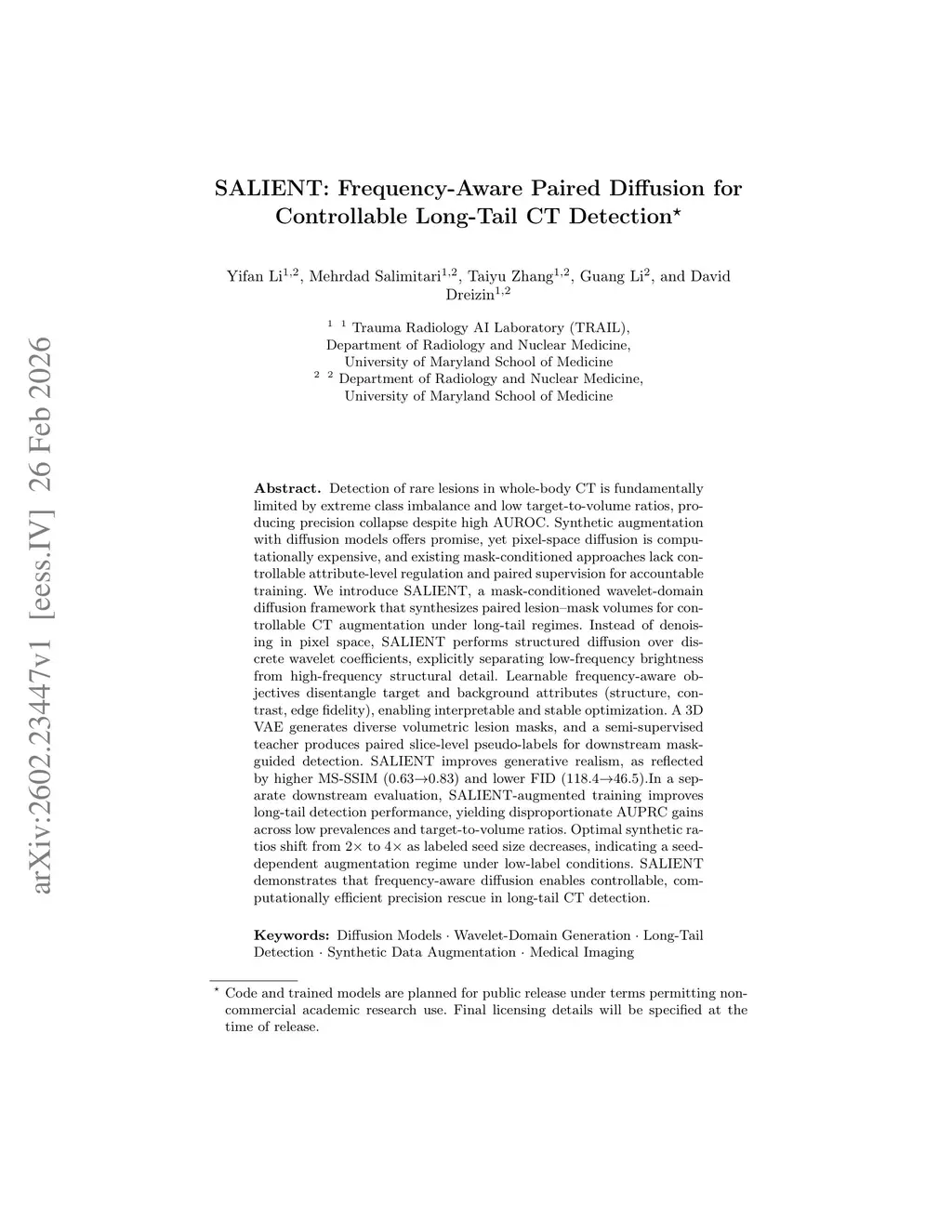 Detection of rare lesions in whole-body CT is fundamentally limited by extreme class imbalance and low target-to-volume ratios, producing precision collapse despite high AUROC. Synthetic augmentation with diffusion models offers promise, yet pixel-space diffusion is computationally expensive, and existing mask-conditioned approaches lack controllable attribute-level regulation and paired supervision for accountable training. We introduce SALIENT, a mask-conditioned wavelet-domain diffusion framework that synthesizes paired lesion-masking volumes for controllable CT augmentation under long-tail regimes. Instead of denoising in pixel space, SALIENT performs structured diffusion over discrete wavelet coefficients, explicitly separating low-frequency brightness from high-frequency structural detail. Learnable frequency-aware objectives disentangle target and background attributes (structure, contrast, edge fidelity), enabling interpretable and stable optimization. A 3D VAE generates diverse volumetric lesion masks, and a semi-supervised teacher produces paired slice-level pseudo-labels for downstream mask-guided detection. SALIENT improves generative realism, as reflected by higher MS-SSIM (0.63 to 0.83) and lower FID (118.4 to 46.5). In a separate downstream evaluation, SALIENT-augmented training improves long-tail detection performance, yielding disproportionate AUPRC gains across low prevalences and target-to-volume ratios. Optimal synthetic ratios shift from 2x to 4x as labeled seed size decreases, indicating a seed-dependent augmentation regime under low-label conditions. SALIENT demonstrates that frequency-aware diffusion enables controllable, computationally efficient precision rescue in long-tail CT detection.